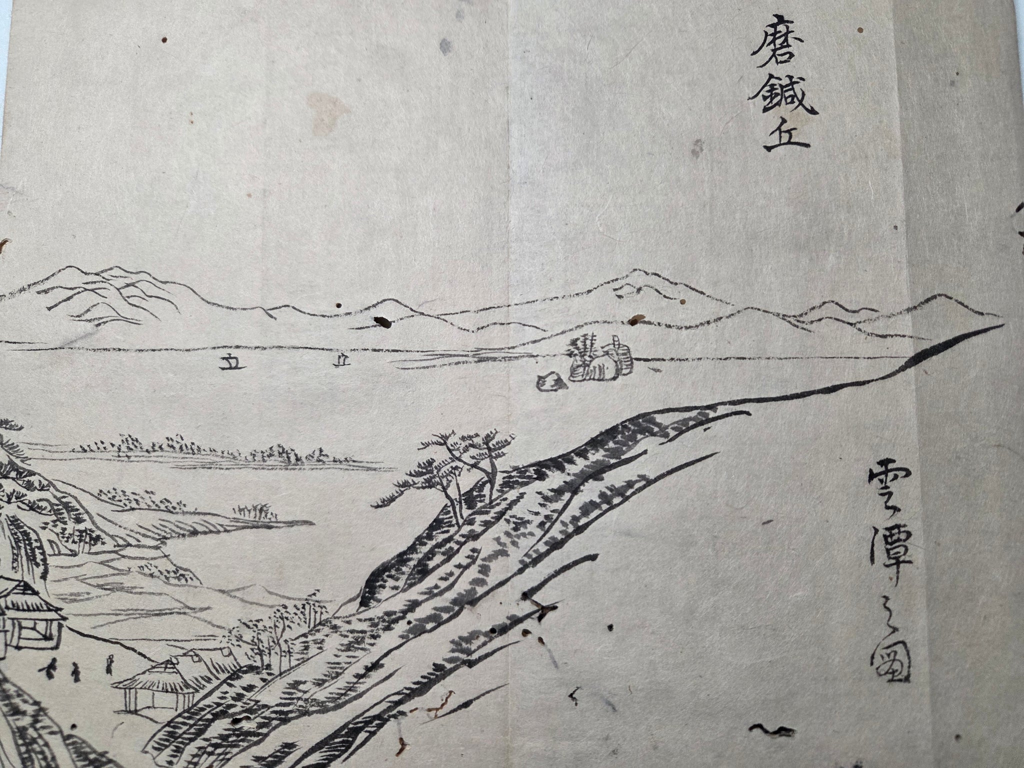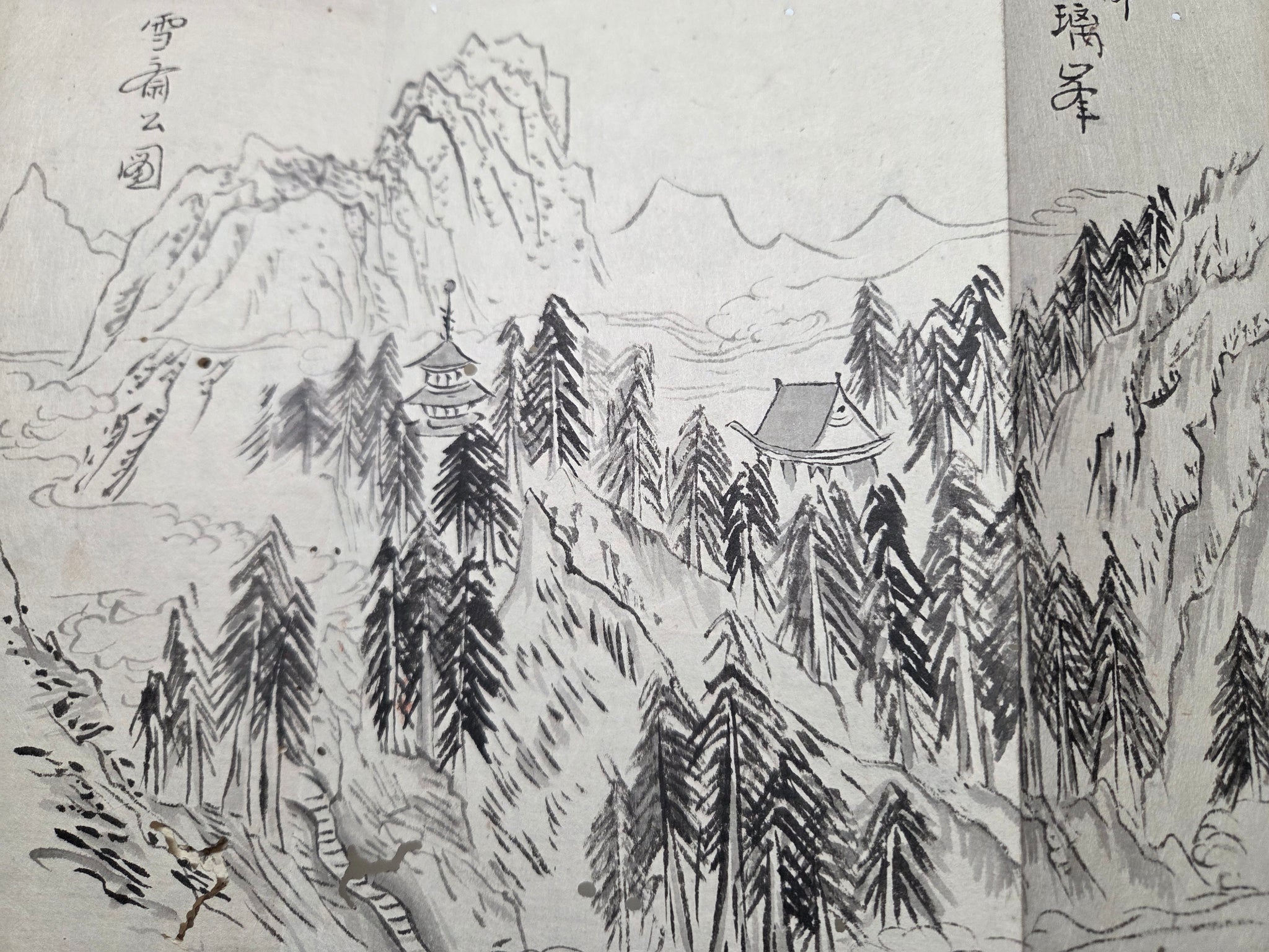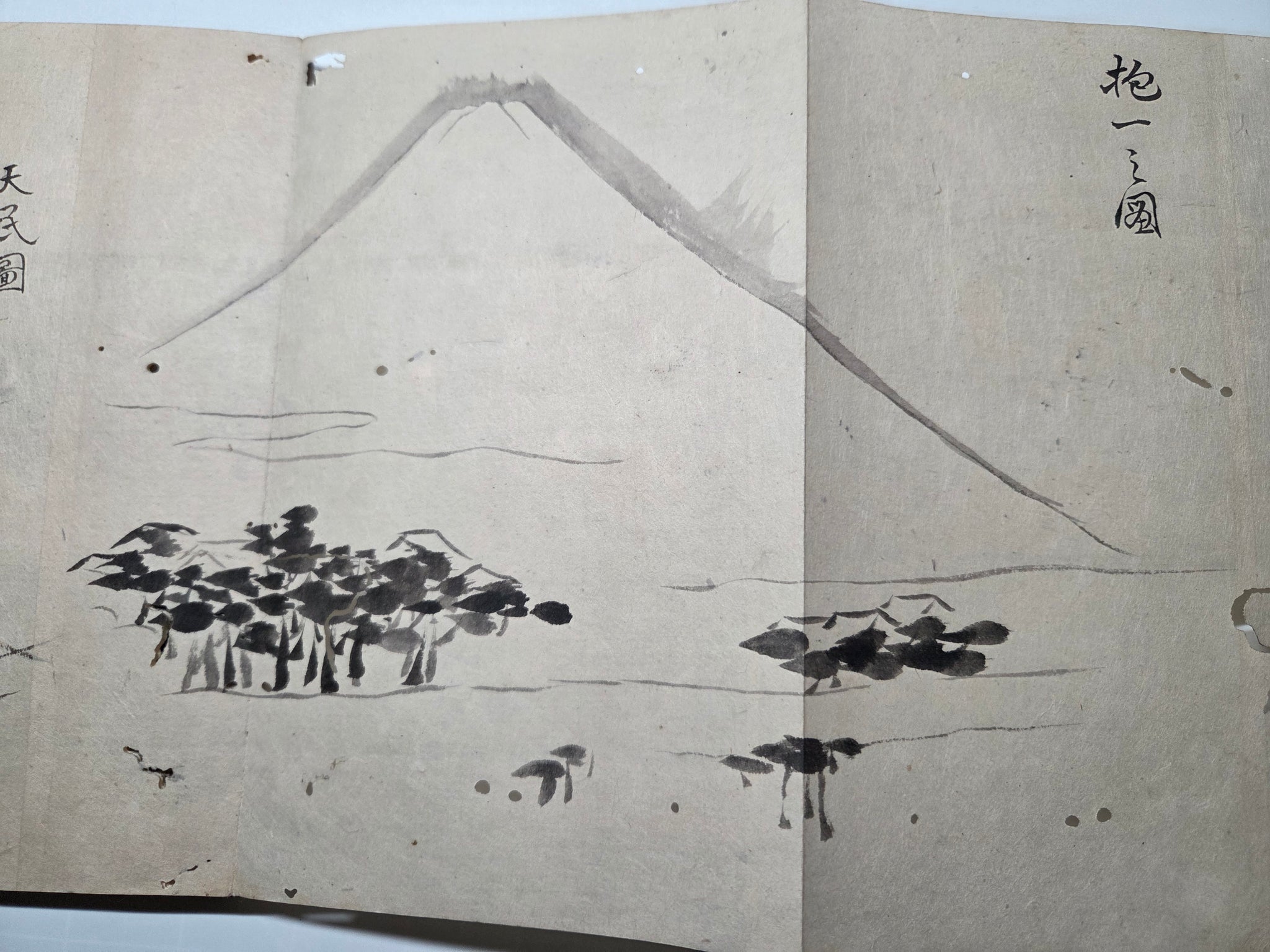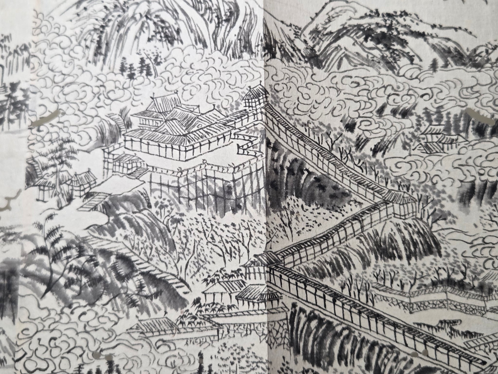 A Late Edo to Meiji Period, 19th century manuscript sketchbook, consisting of several dozen pages of ink landscapes and more, produced by various authors. From mounstainscapes to waterfalls, bridge views and more, there is a considerable selection of large drawings, most being several pages in size.