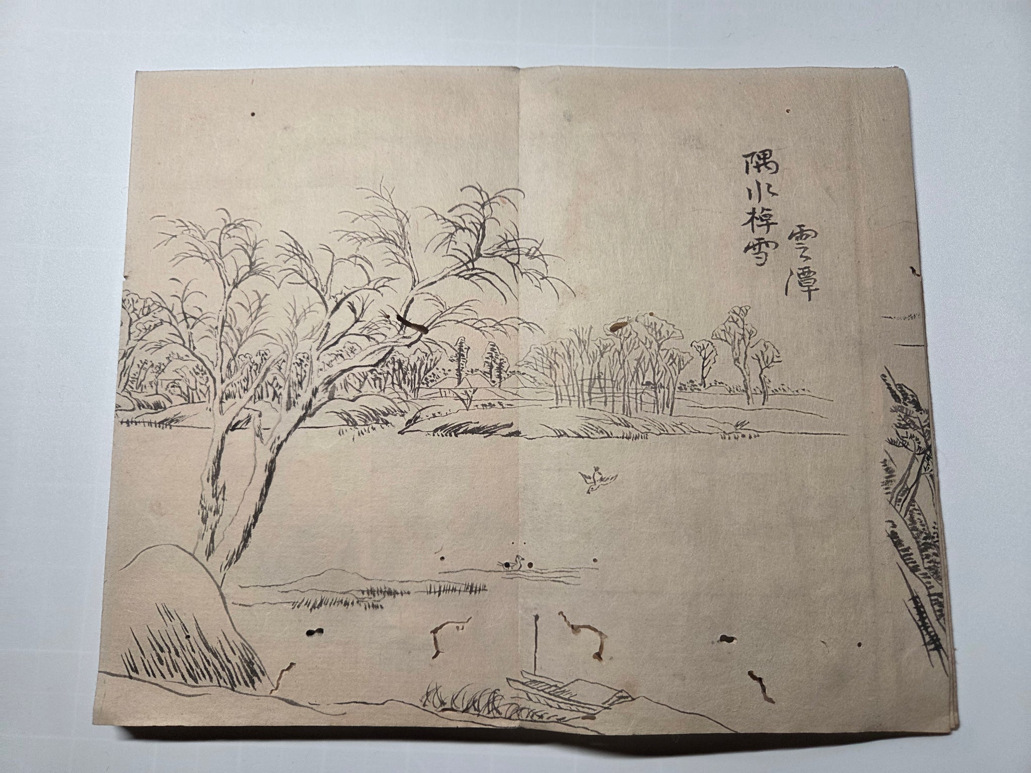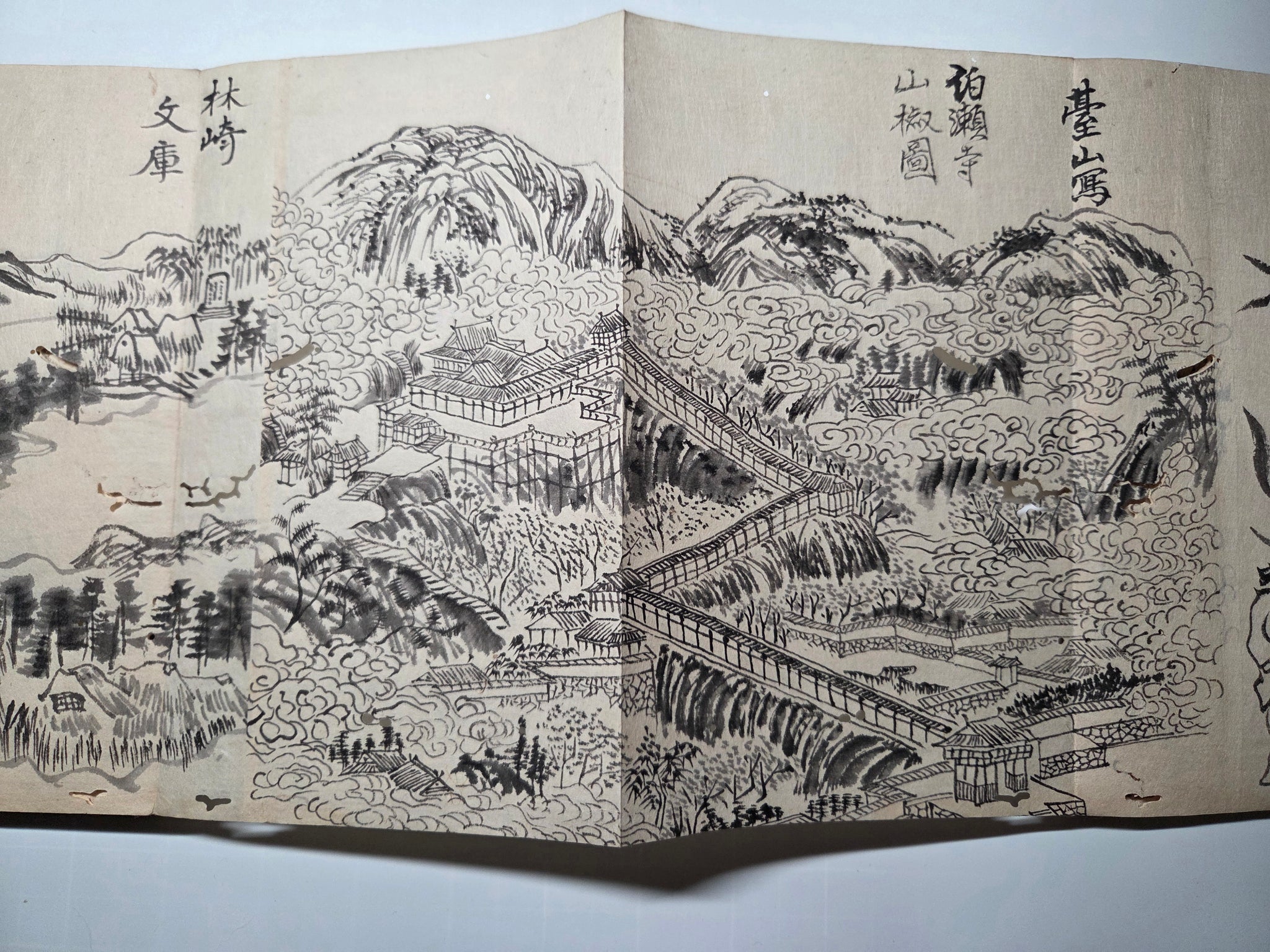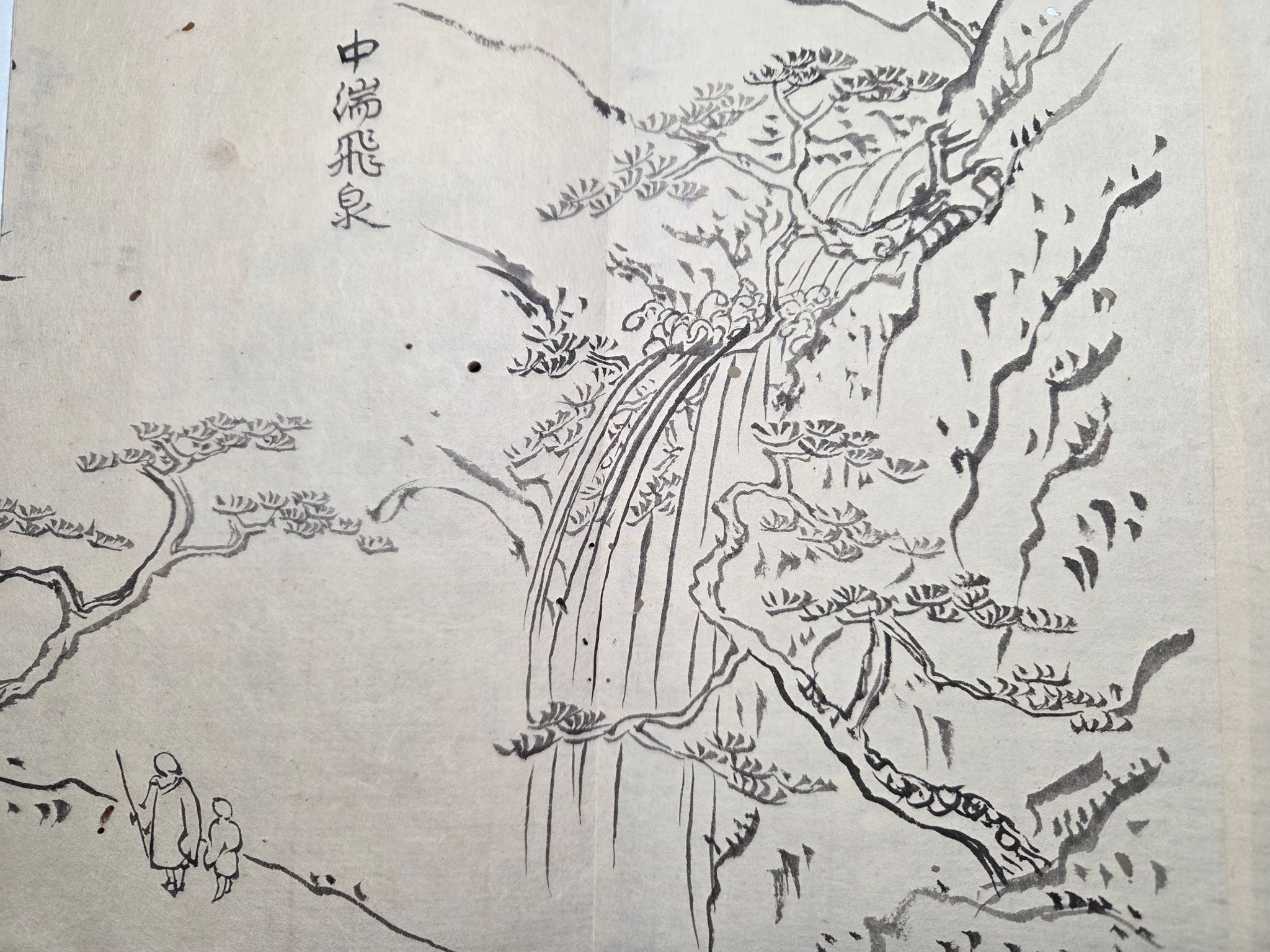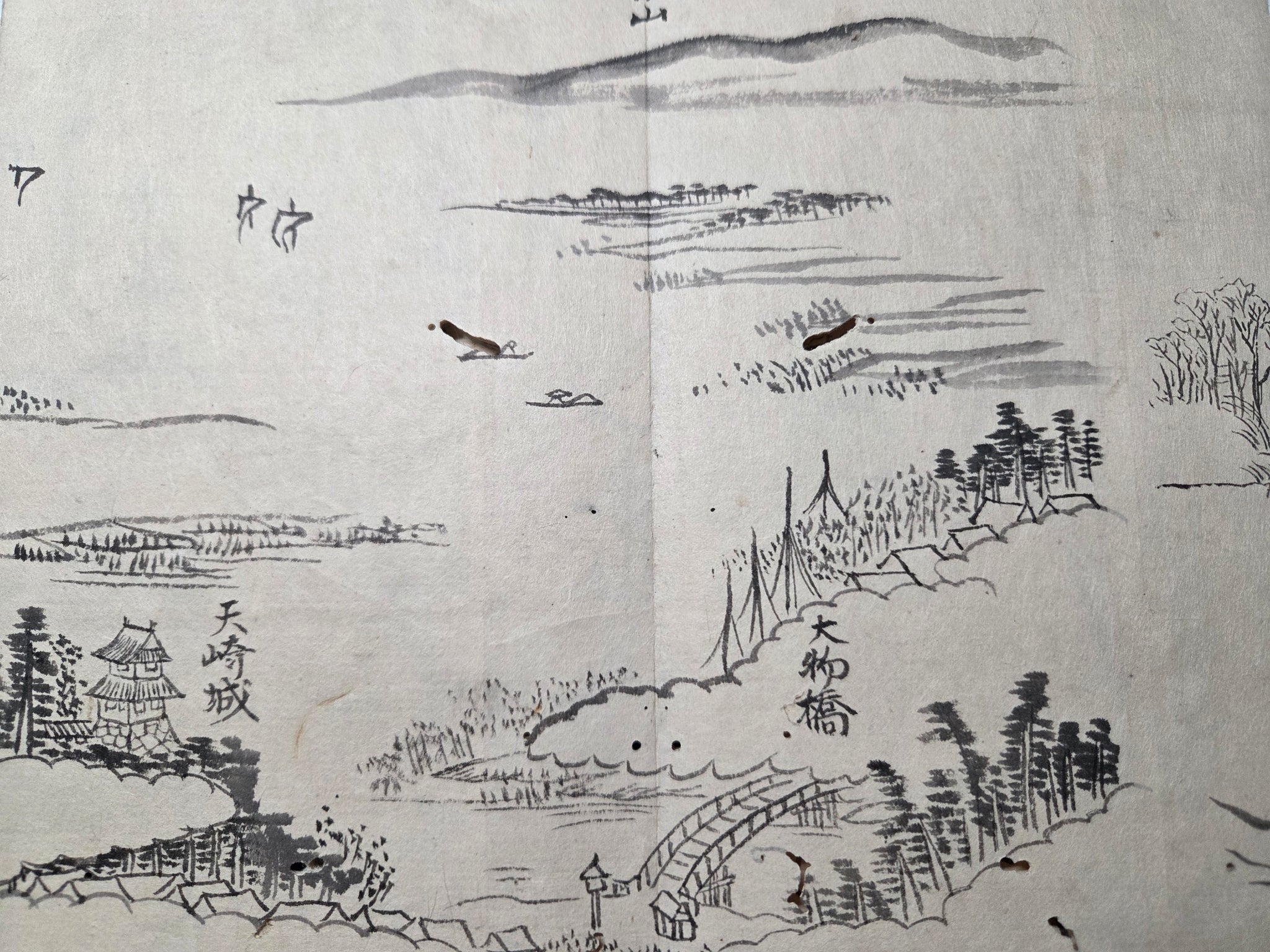 A Late Edo to Meiji Period, 19th century manuscript sketchbook, consisting of several dozen pages of ink landscapes and more, produced by various authors. From mounstainscapes to waterfalls, bridge views and more, there is a considerable selection of large drawings, most being several pages in size.