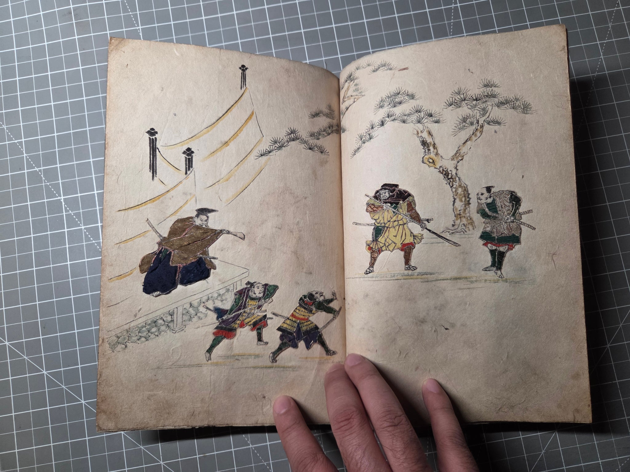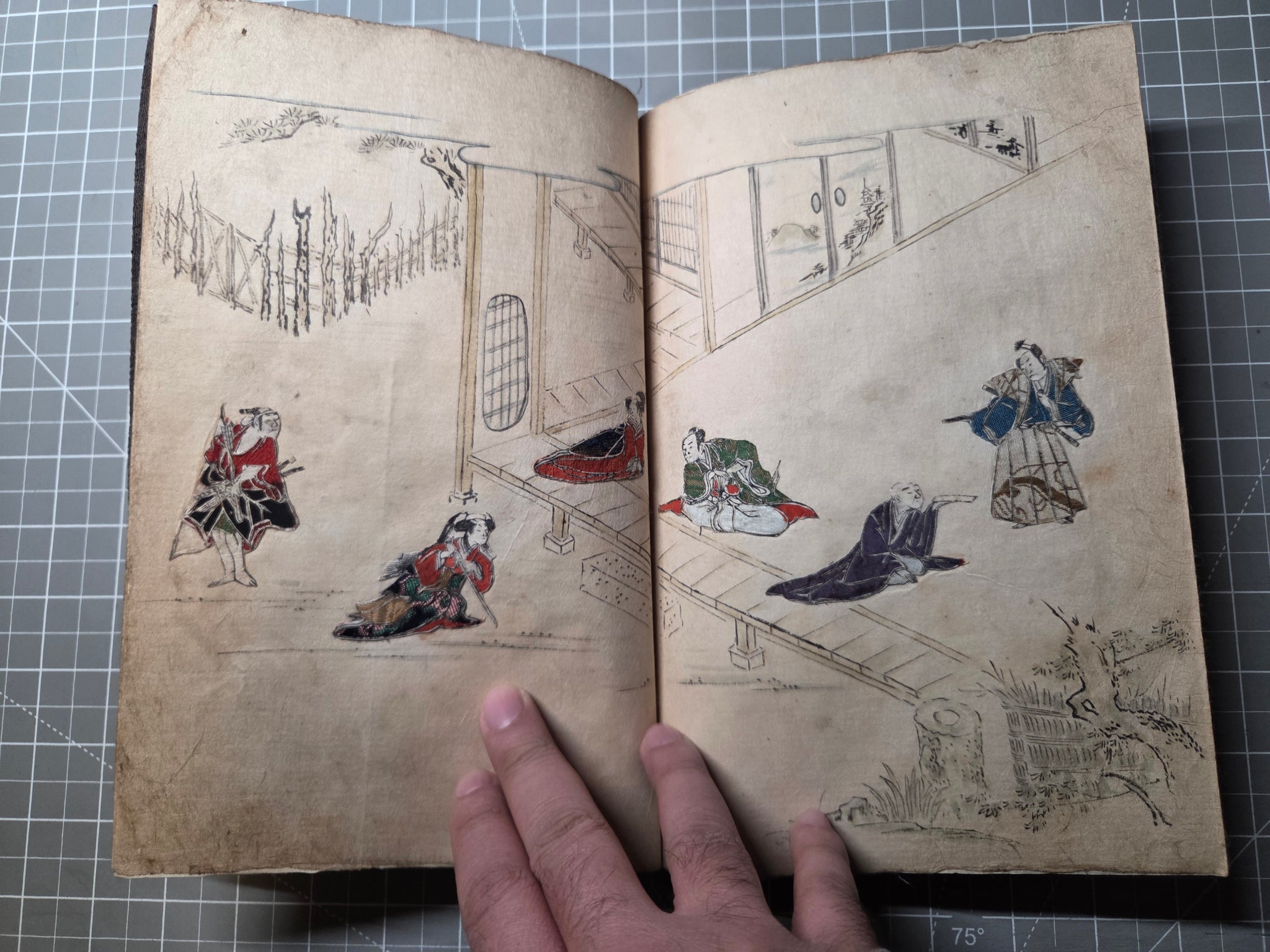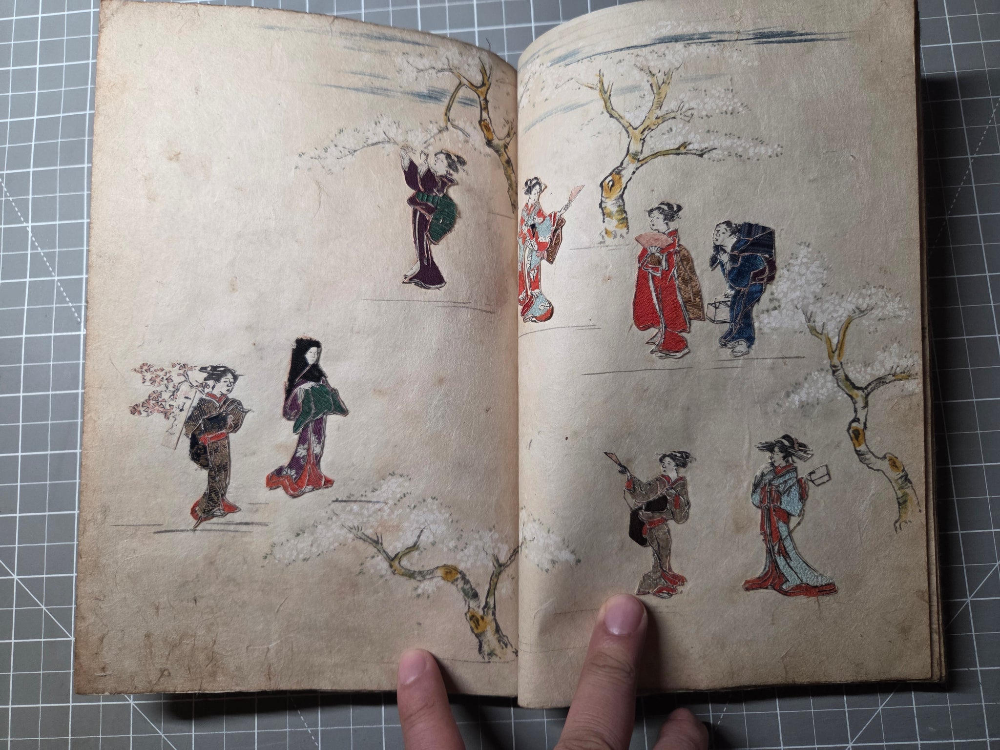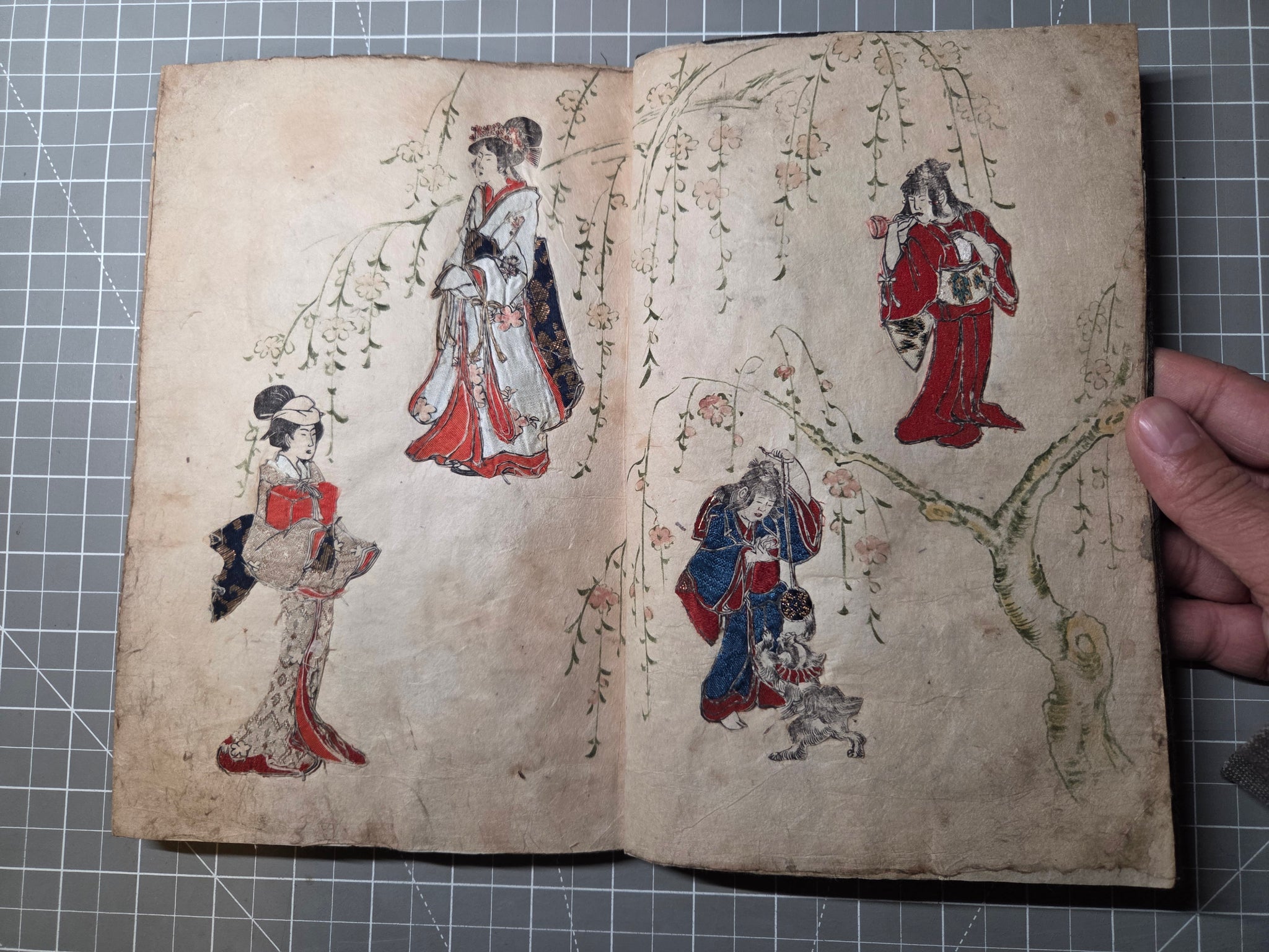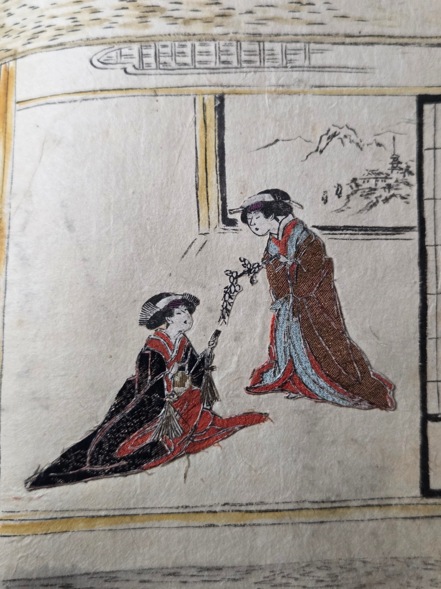 While Oshi-e Hina dolls still exist, and fabric oshi-e on individual sheets have been noted, this is the first time I have ever seen a composite manuscript produced in this manner.