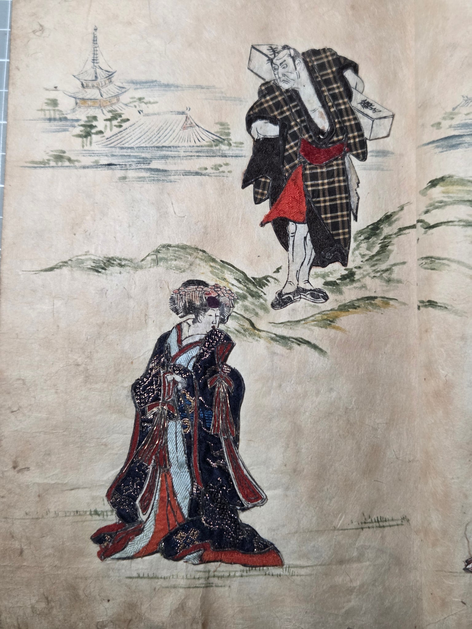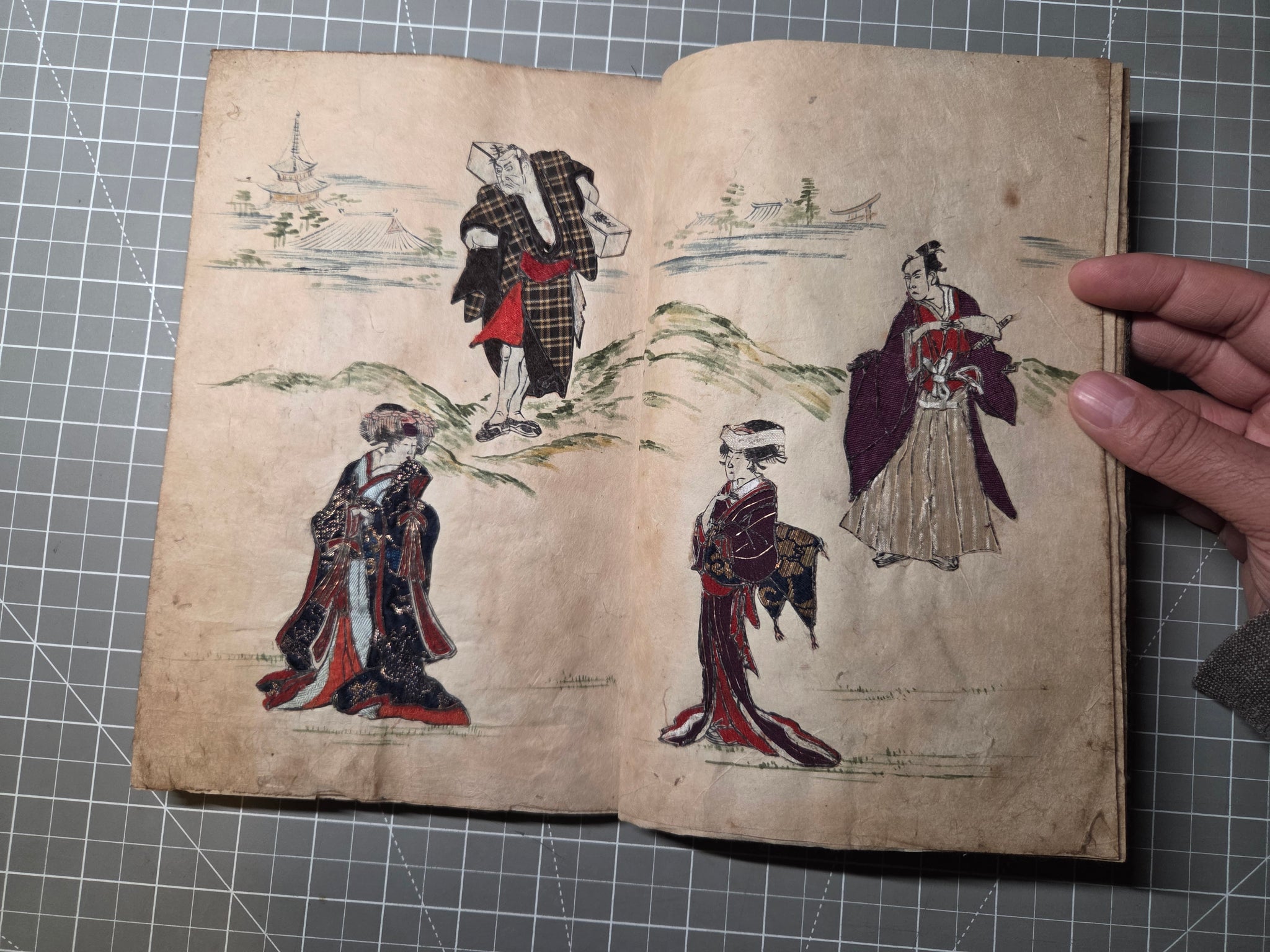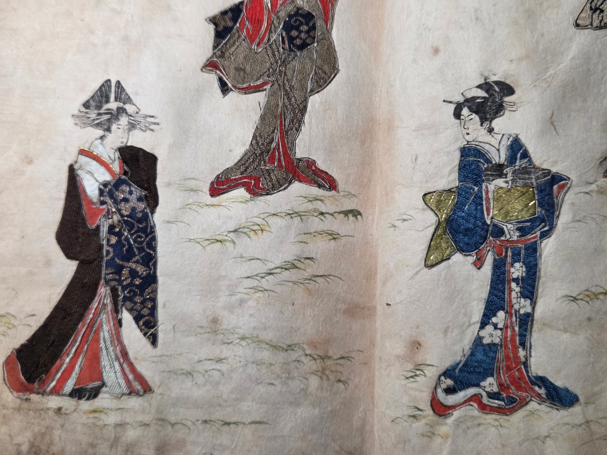 A Late Edo Period, early to mid 19th century manuscript of various figures and scenes of Ukiyo-e, produced using the Oshi-e technique, with the figures vestments and clothing made of kimono fragments and brocade, whilst the faces and backgrounds are all drawn and colored by hand.