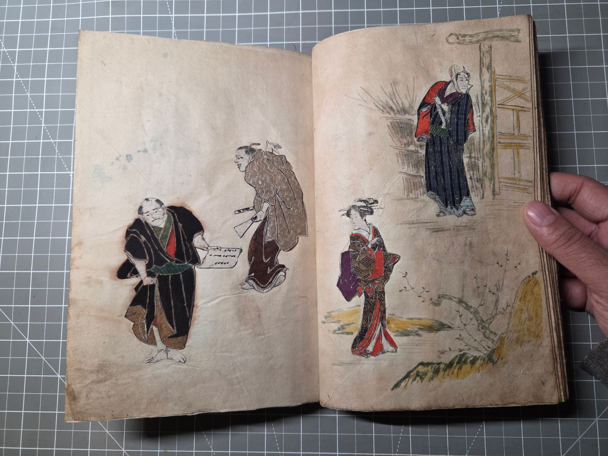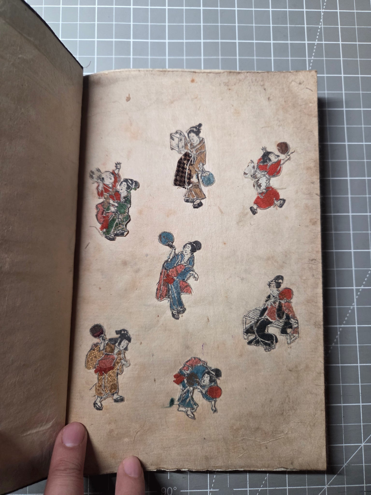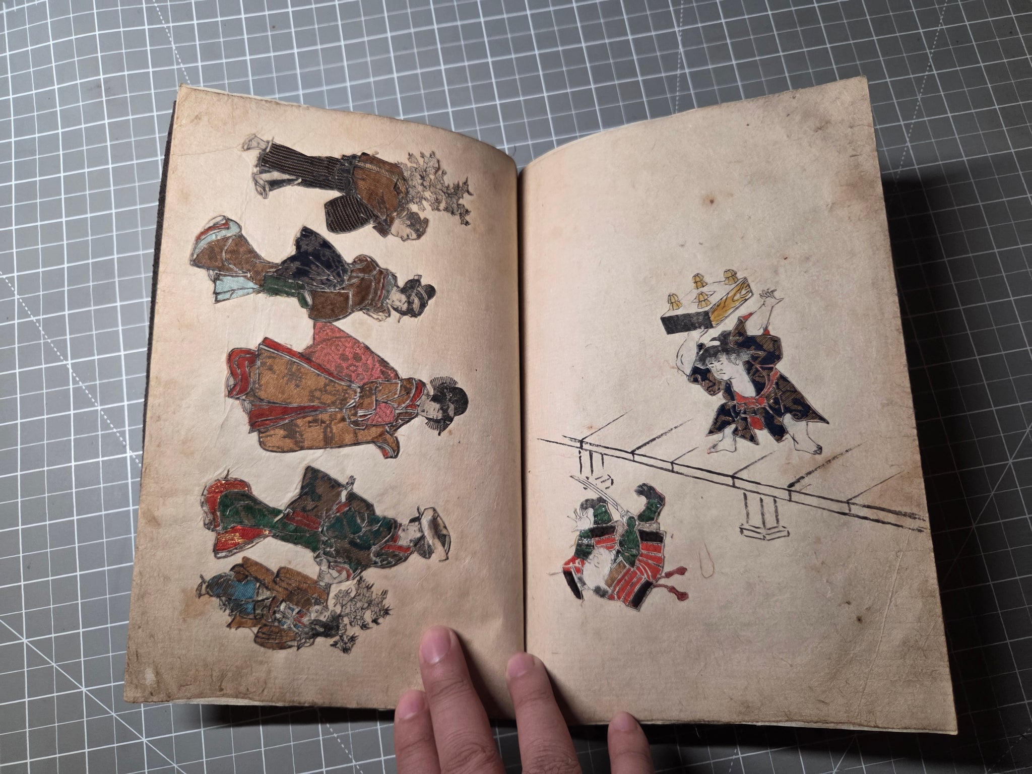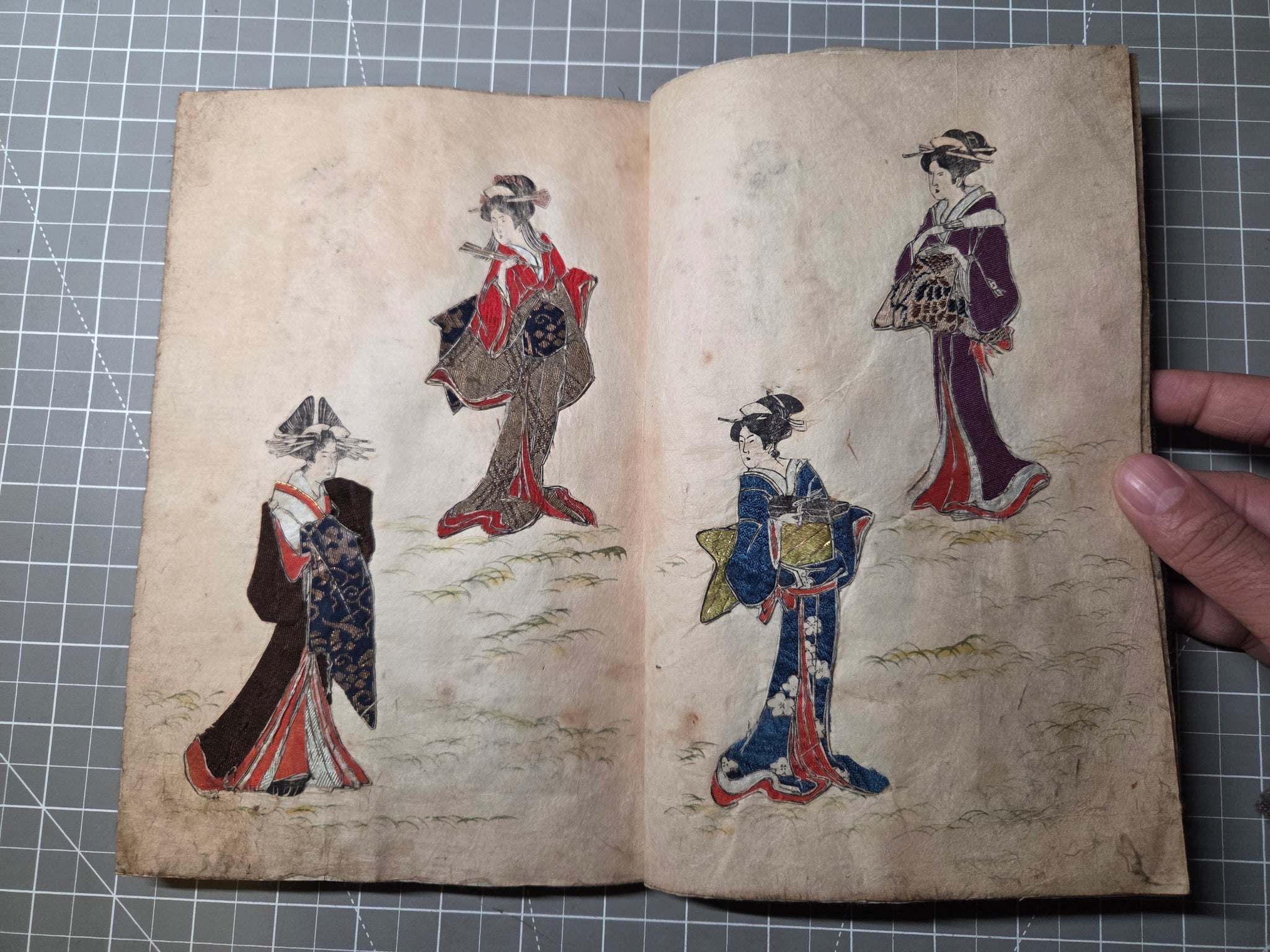 A Late Edo Period, early to mid 19th century manuscript of various figures and scenes of Ukiyo-e, produced using the Oshi-e technique, with the figures vestments and clothing made of kimono fragments and brocade, whilst the faces and backgrounds are all drawn and colored by hand.