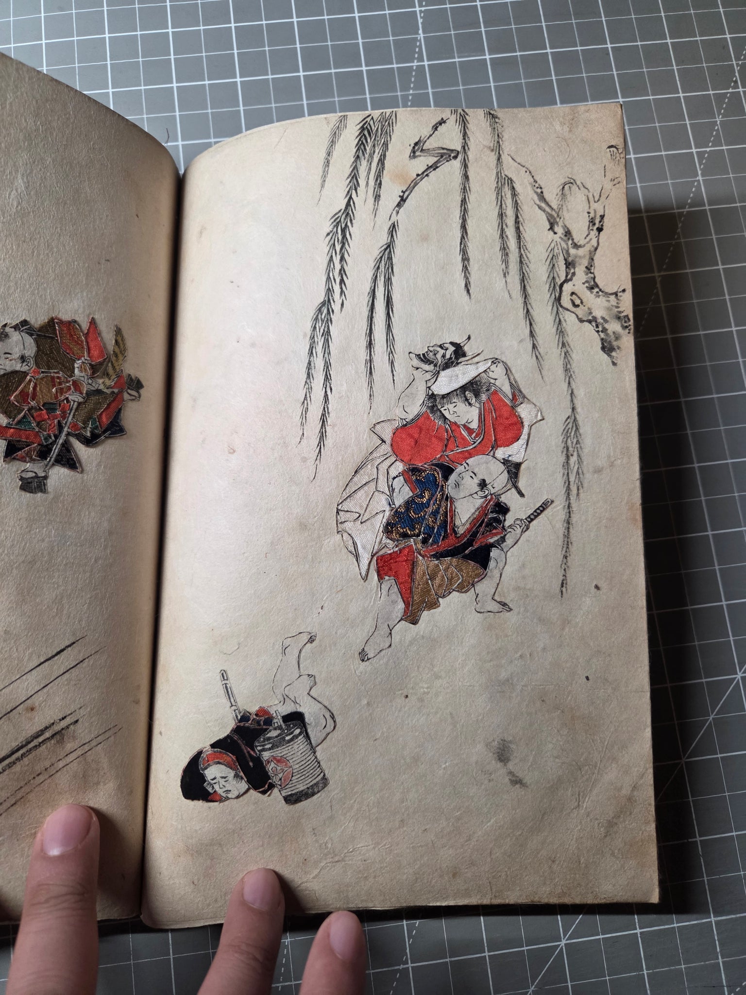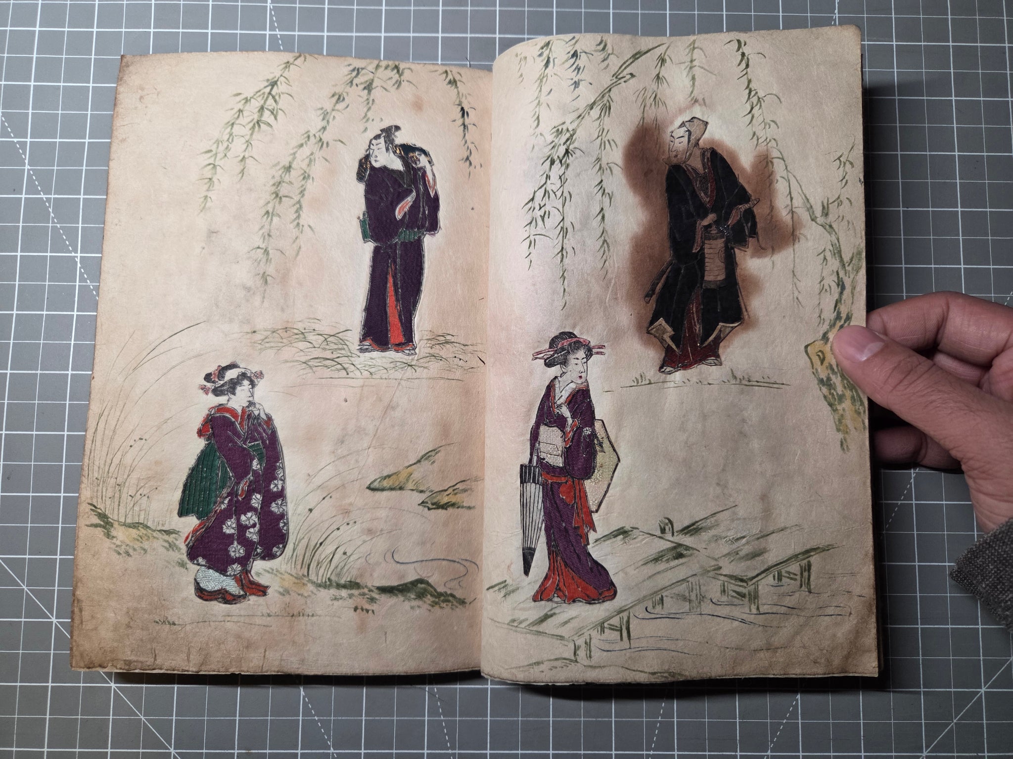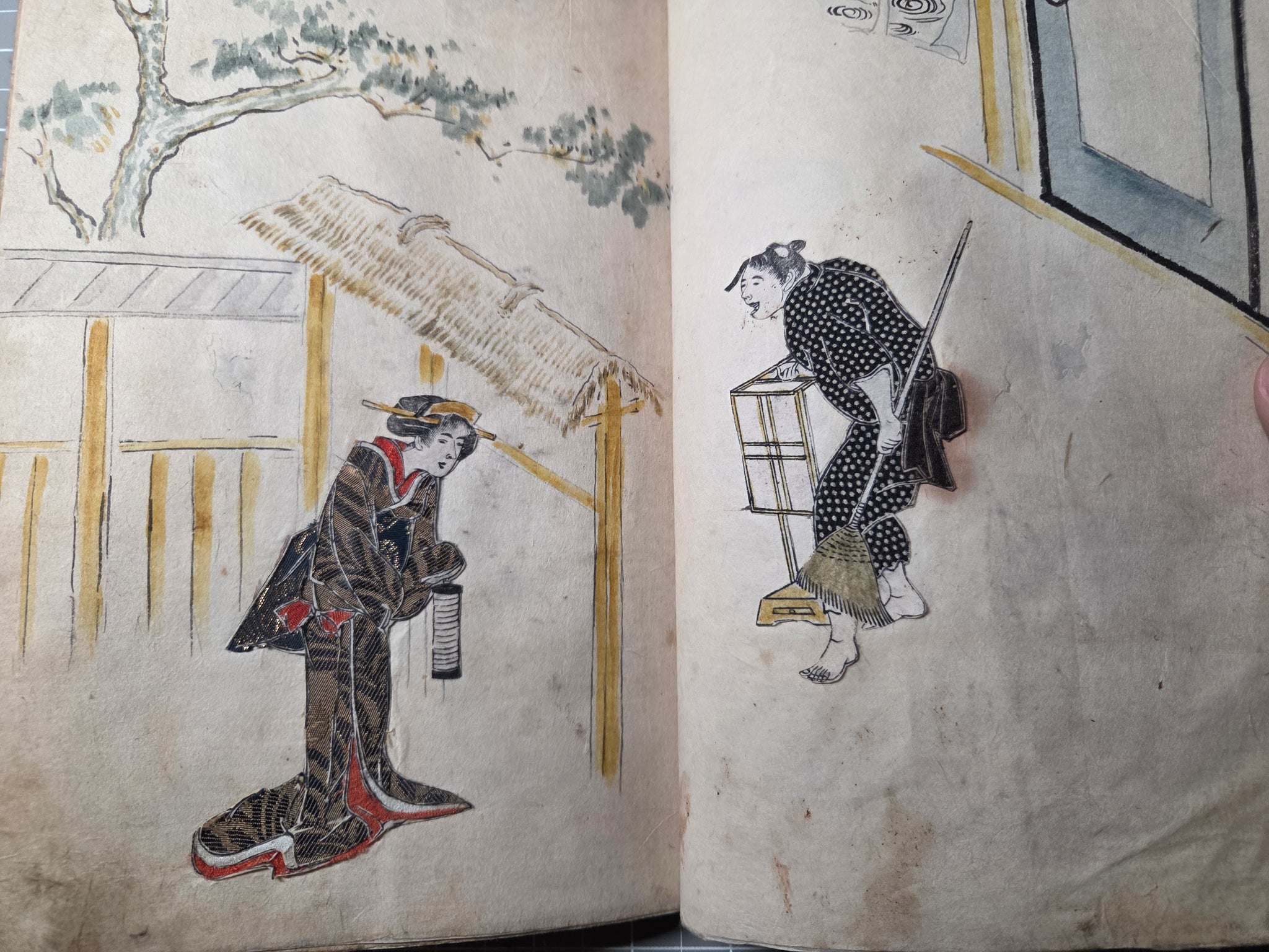 Every figure has been produced with meticulous handiwork to forming every individual outfit, and some kimonos are practically glittering with brocade detailing and various hues. Whomever produced this manuscript put care into all 88 figures here.
