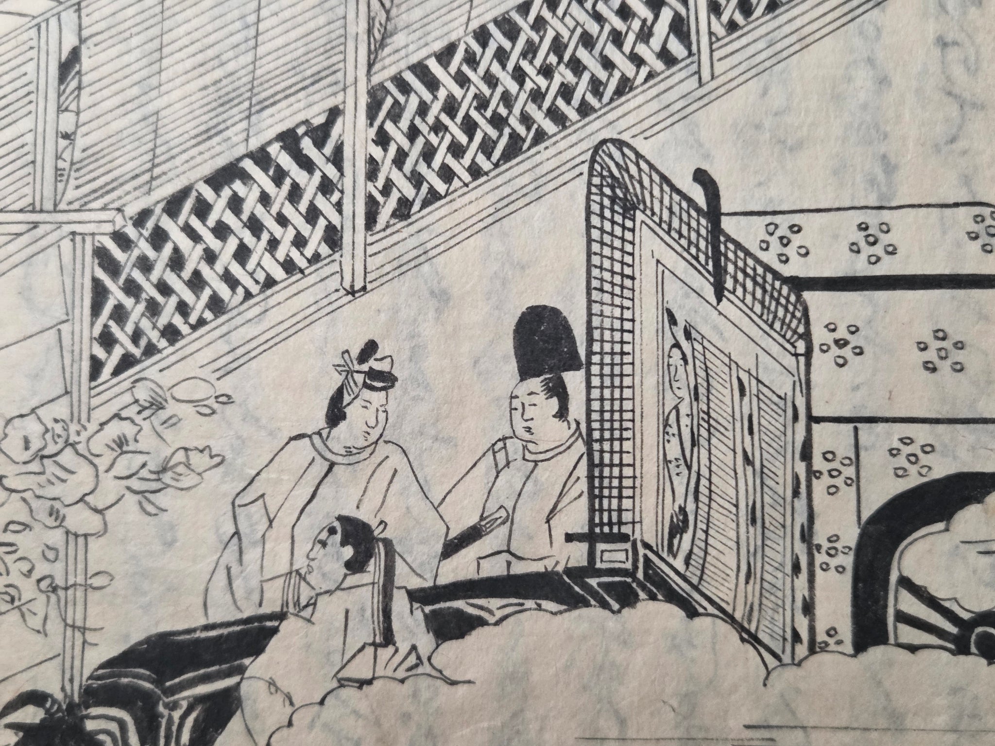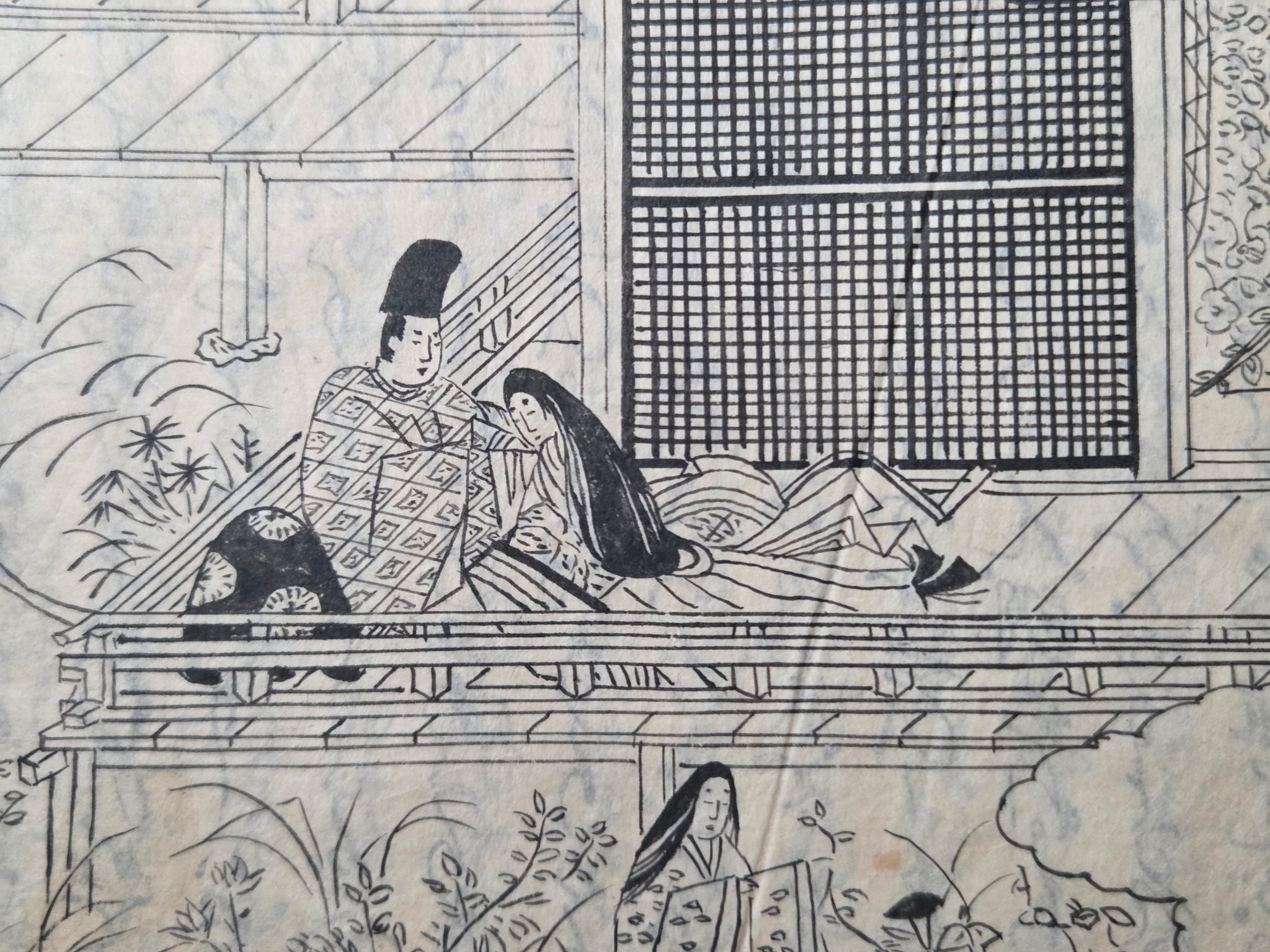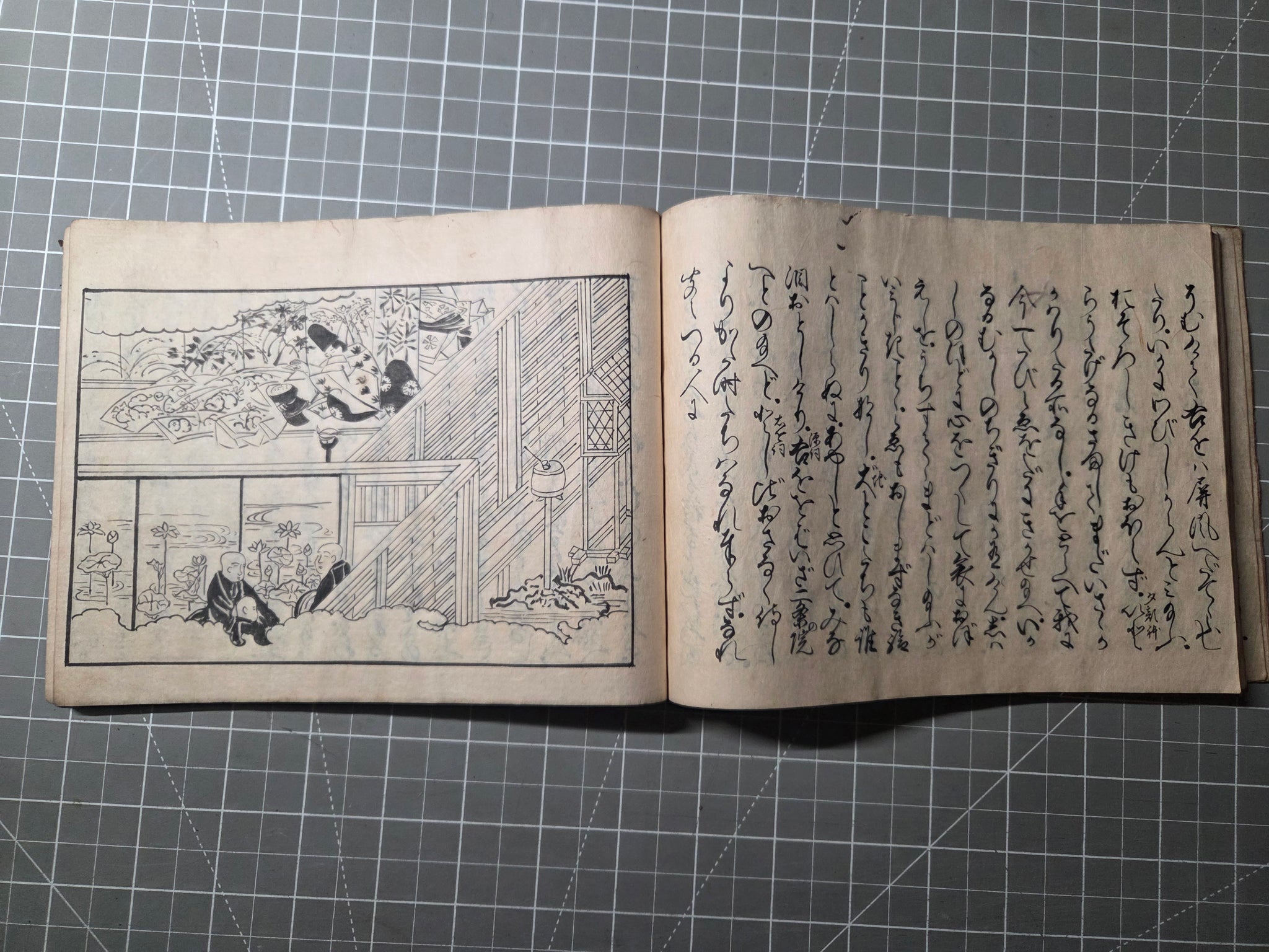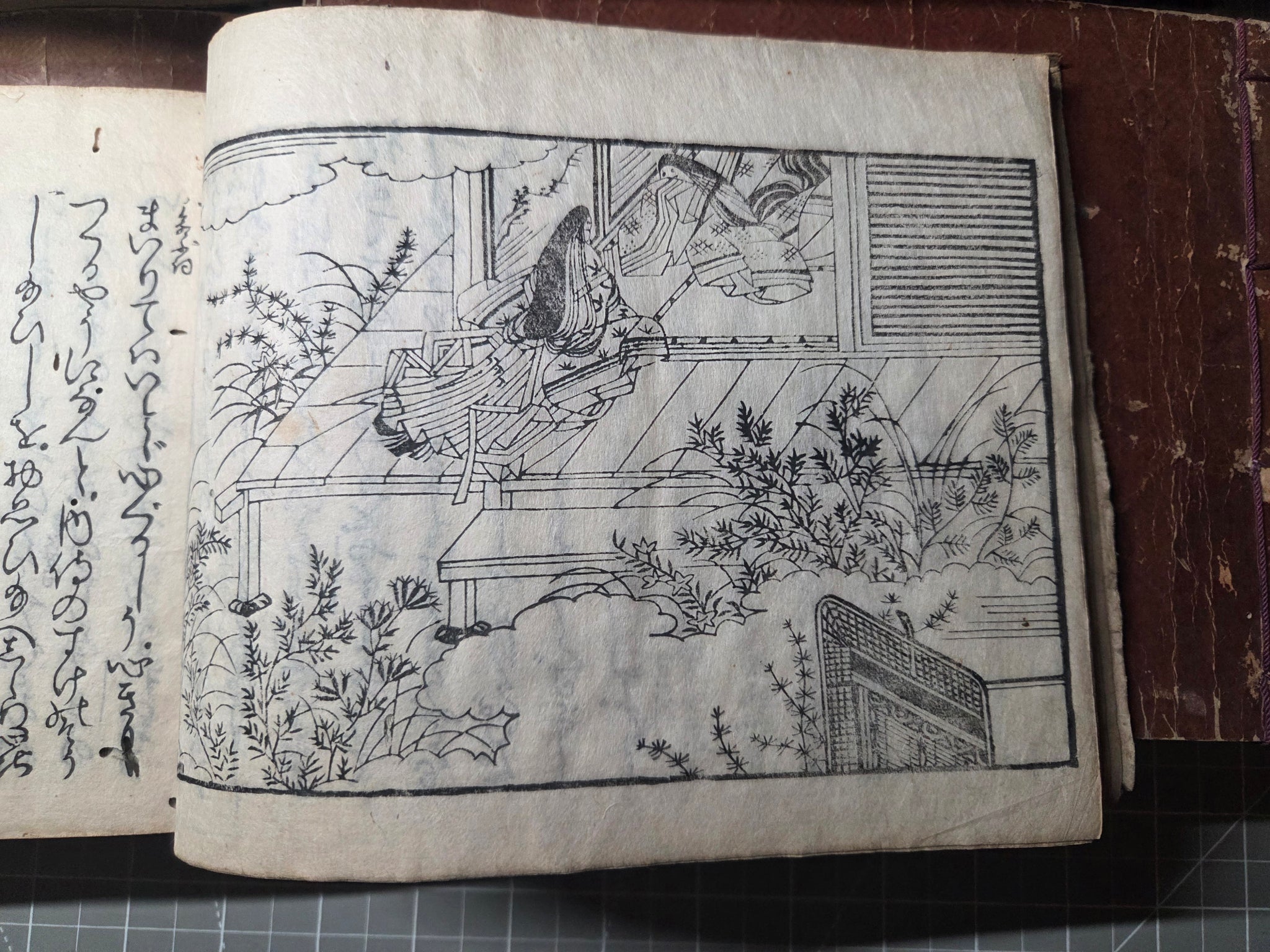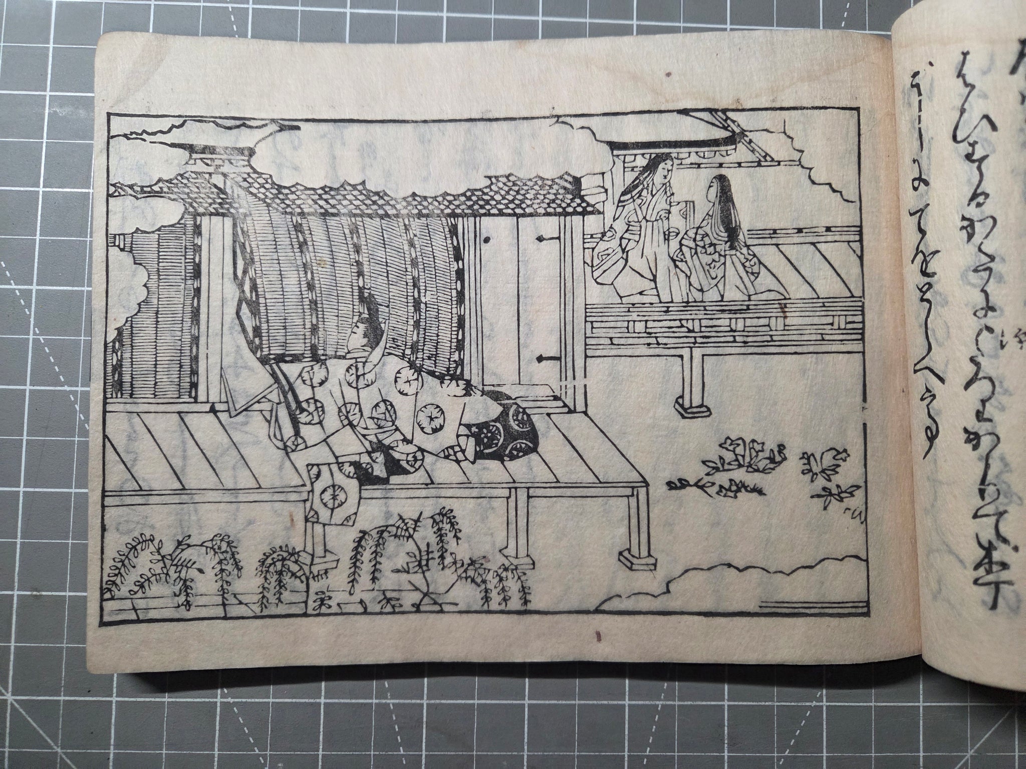 Since the Heian Period, numerous copies of the Tale of Genji have existed in the form of manuscripts, and those who could not afford the manuscripts became familiarized with the text through the summarized editions, usually produced with commentaries. The Eiri Genji, first printed in Keian 3 (1650), was known as the was the first edition to be provided that included illustrations in addition to the text itself. This is the Manji 3 (1660) edition, being the third known variant, and referred to as the yokohon edition because of its landscape format.
