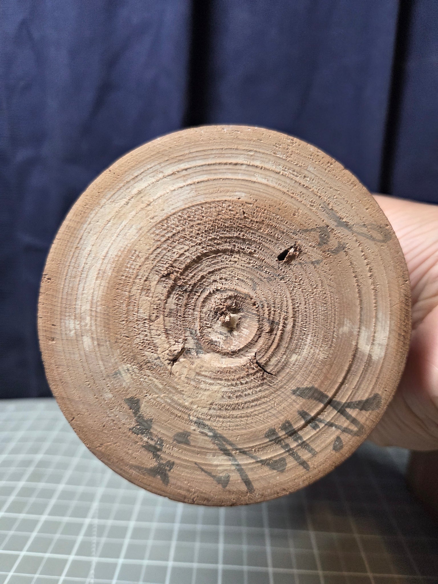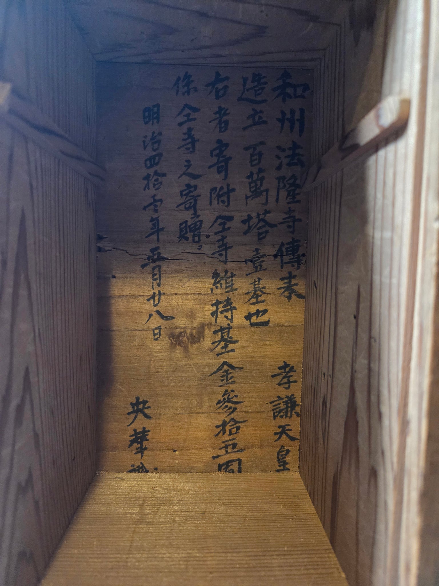 This example bears the rare, noted, earlier provenance, stating that in Meiji 41 (1908), there was an accompanying Certificate of Presentation, and that it was clearly documented as a Horyu-ji Temple example of a Hyakumantō Darani. As is with this example, it is contained in an early twentieth-century box with the Horyu-ji Temple gifting stamp to the box, and a sticker denoting this information. There are also photocopies of the original certificates and documents that would have been provided, displaying the same temple stamp. A surprising rarity that it is seen here, as many of the deaccessioned examples seem to have lost their gifted box at some point or another.