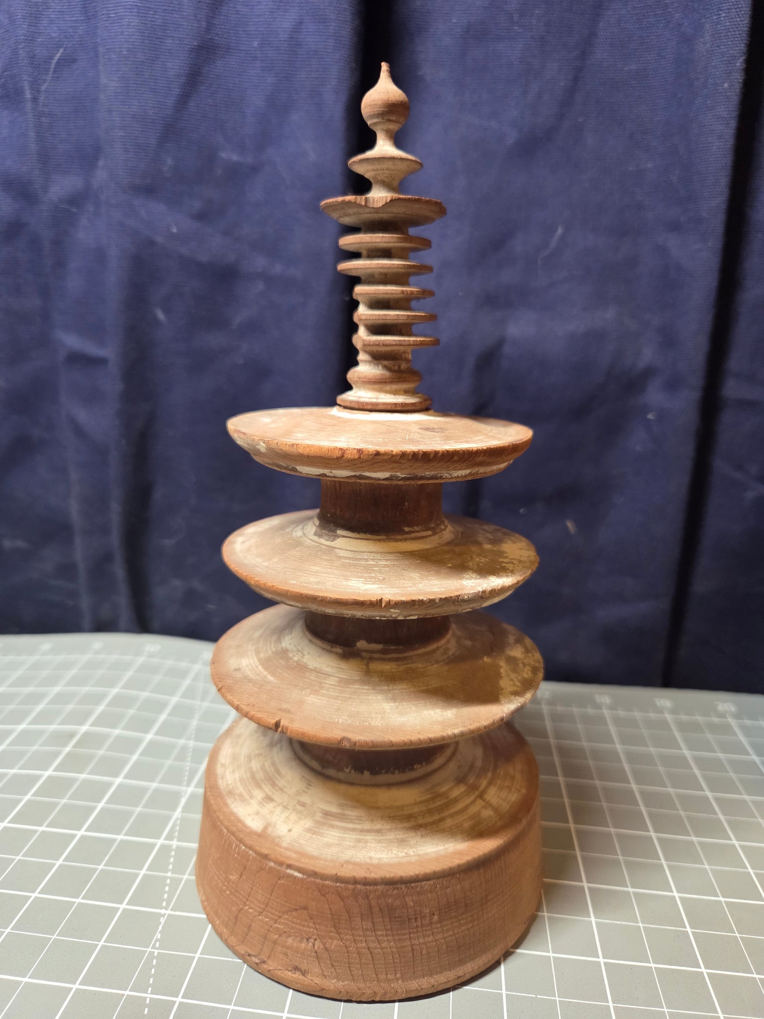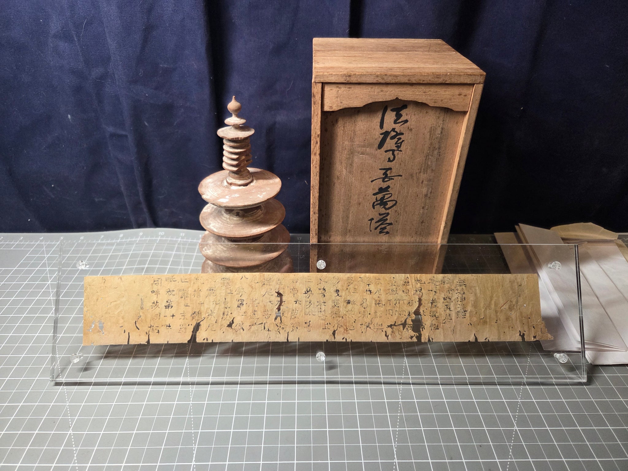 One miniature wooden pagoda (tō) and dhāraṇī ritual text, 21.4 x 10.4 cm for pagoda, 6 x 41 cm for the dhāraṇī ritual text