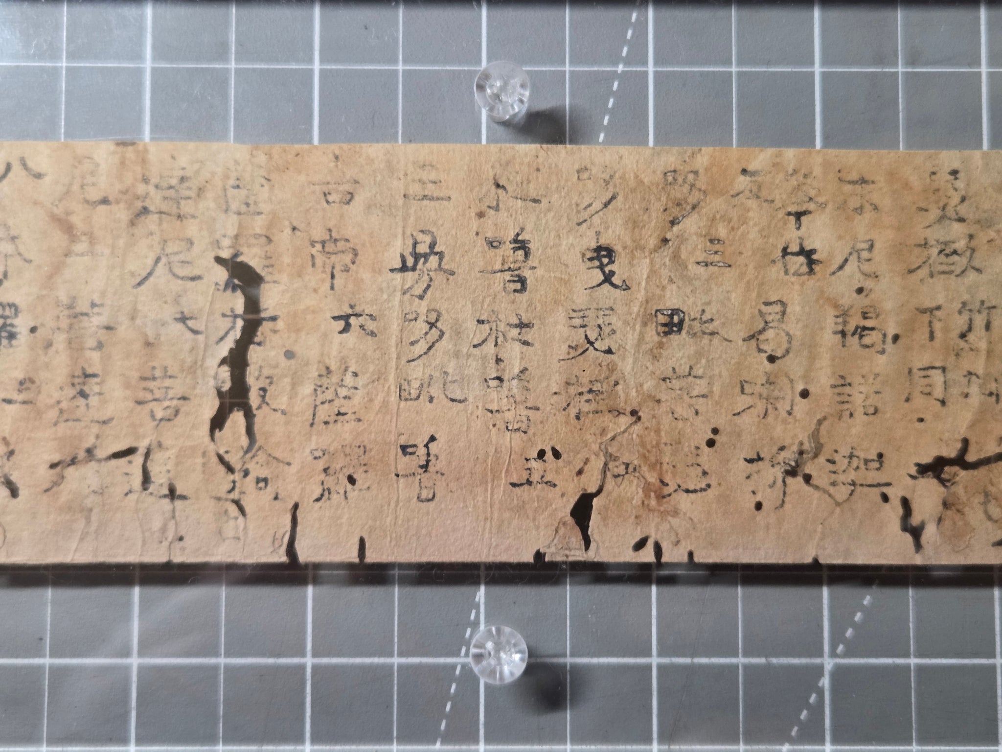The dhāraṇī ritual text has been neatly placed under plexiglass for protection, with removable screws to take the paper out for closer study if needed.