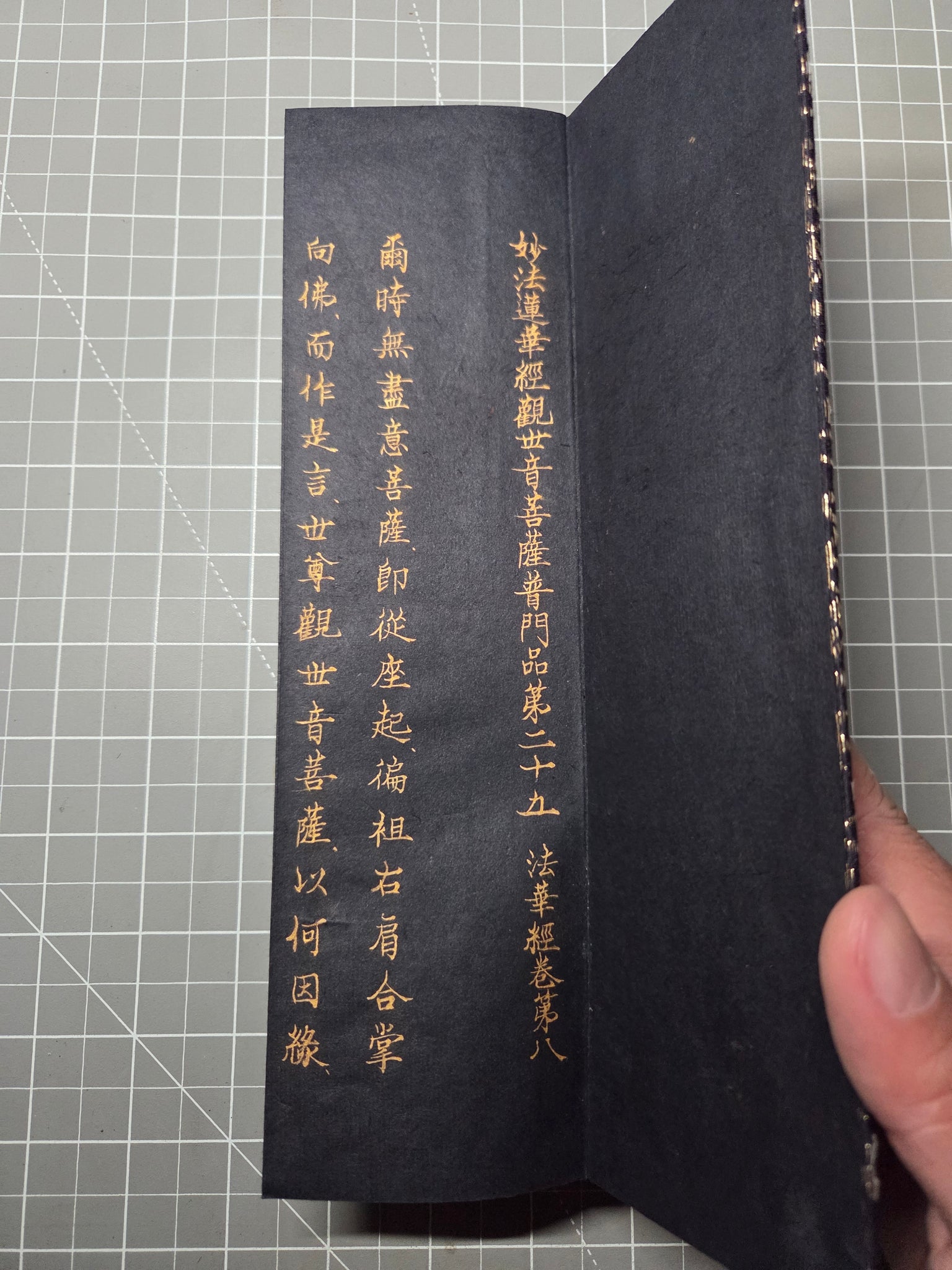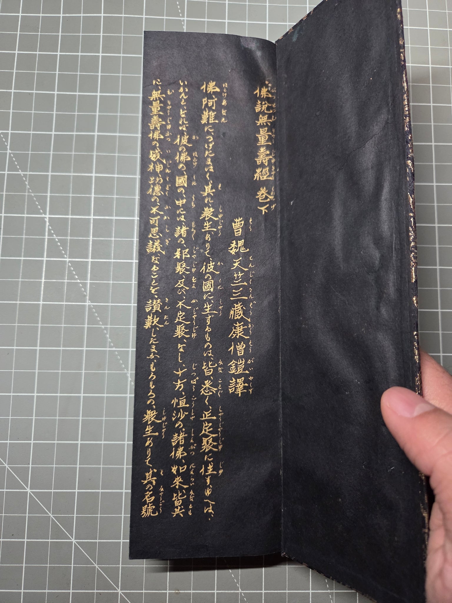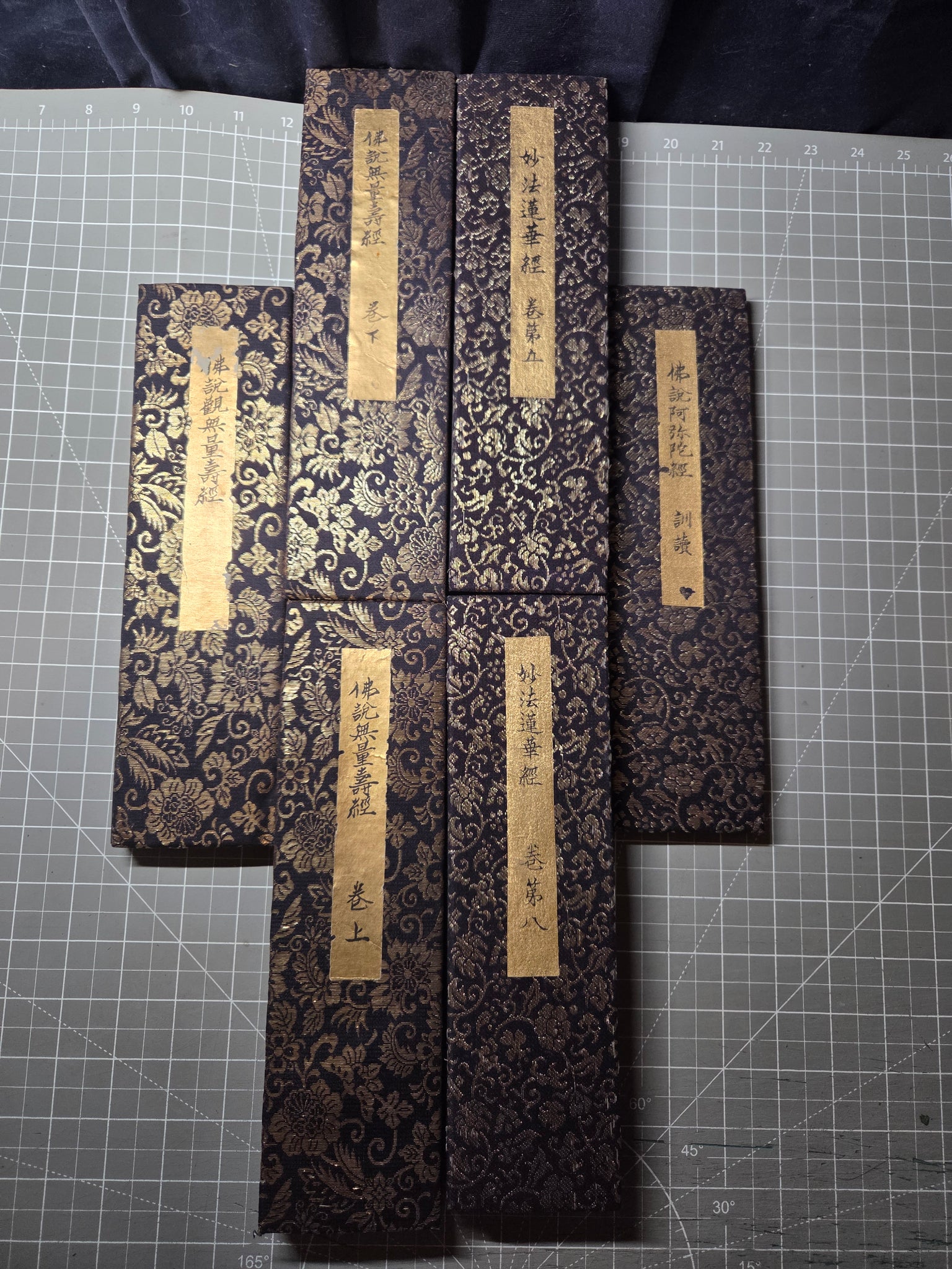 Contained is an unusual collection of several sutras, being a Buddhist Contemplation on the Sutra of Immeasurable life, the Amitabha Sutra, the Infinite Life Sutra, and Lotus Sutra, though only volumes 5 and 8 of 8 are present to the Lotus Sutra.