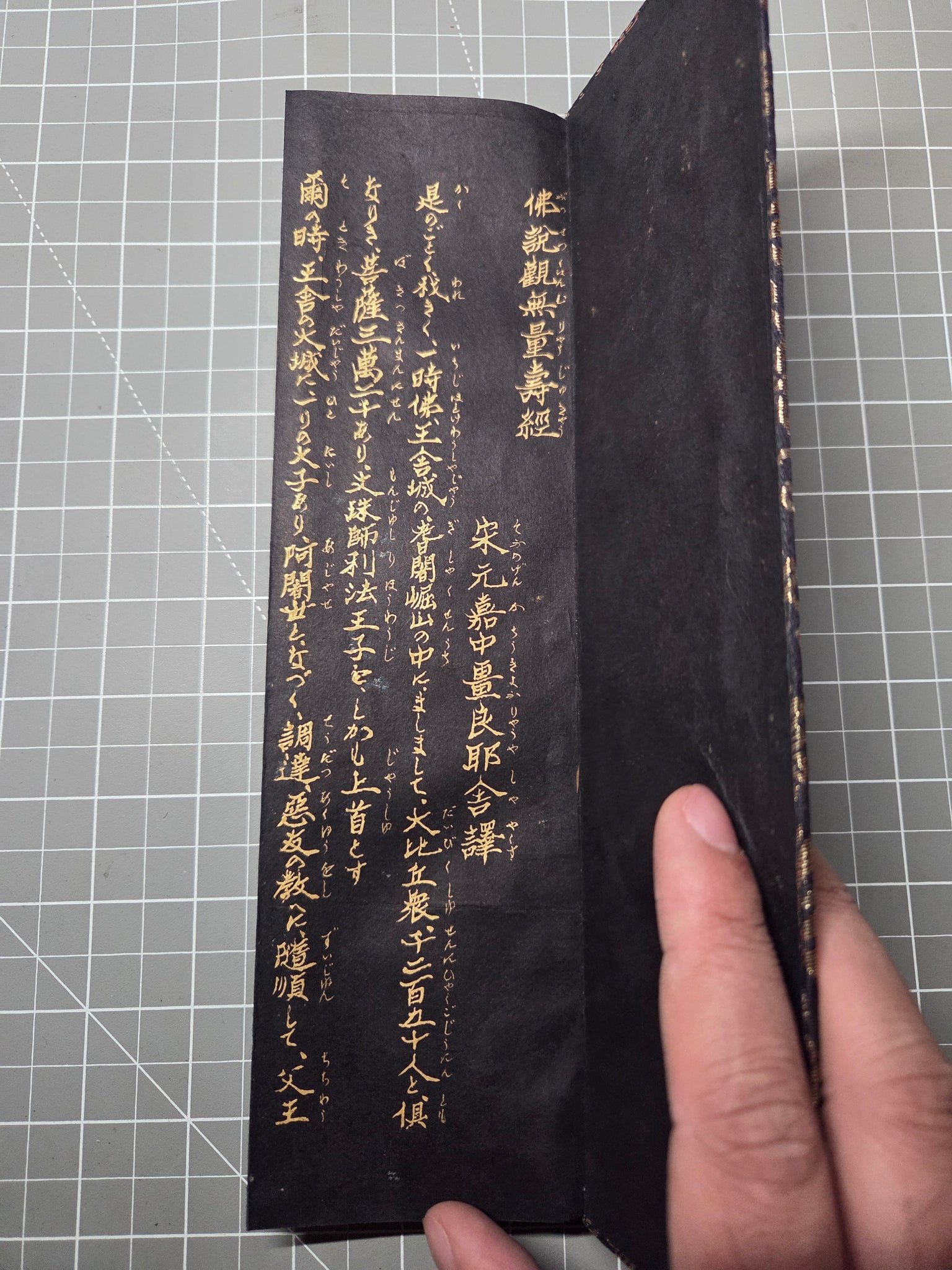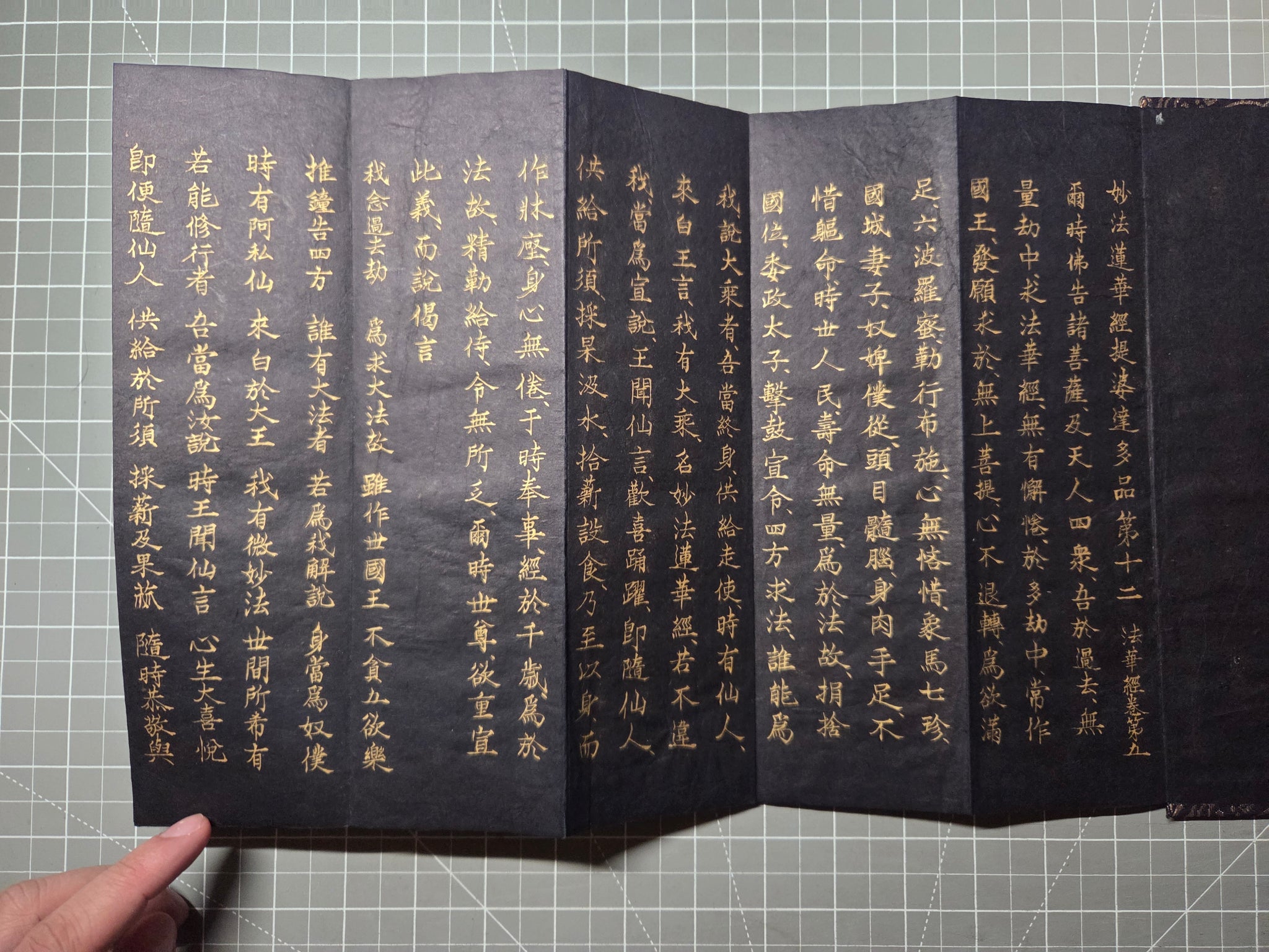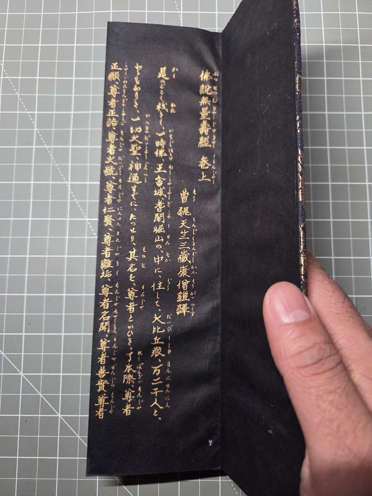Contained is an unusual collection of several sutras, being a Buddhist Contemplation on the Sutra of Immeasurable life, the Amitabha Sutra, the Infinite Life Sutra, and Lotus Sutra, though only volumes 5 and 8 of 8 are present to the Lotus Sutra.