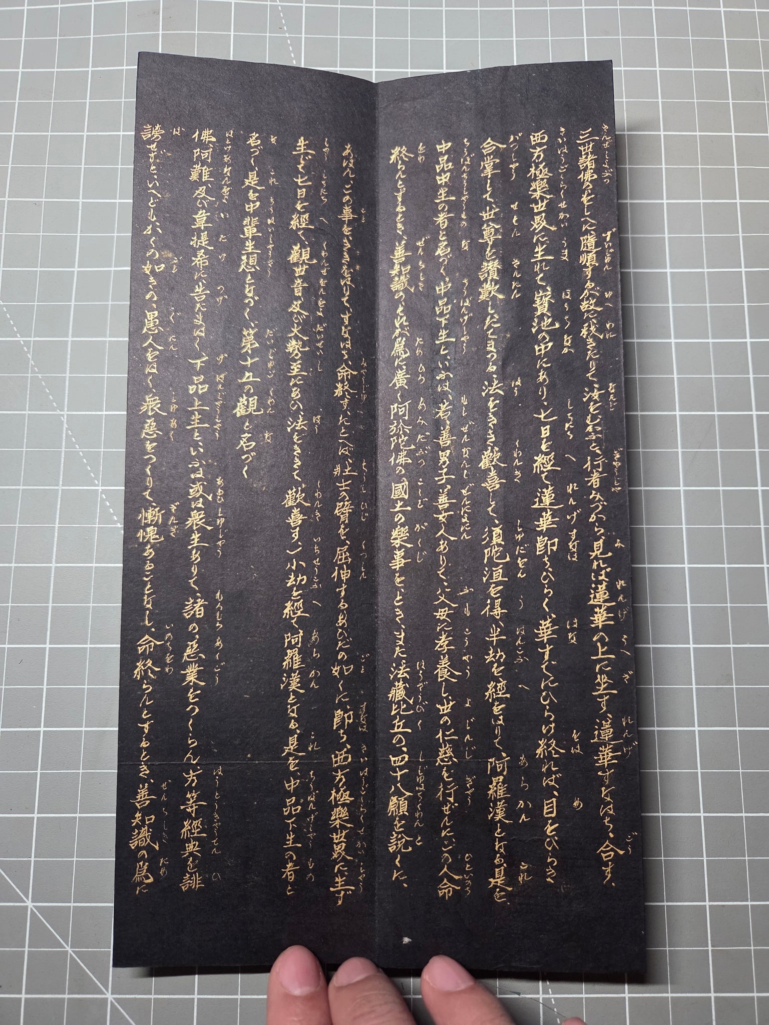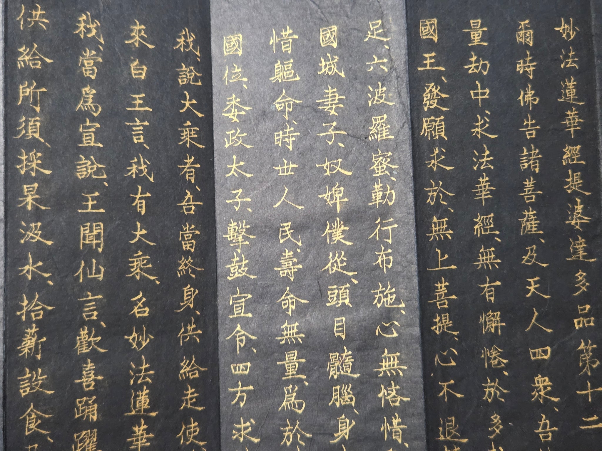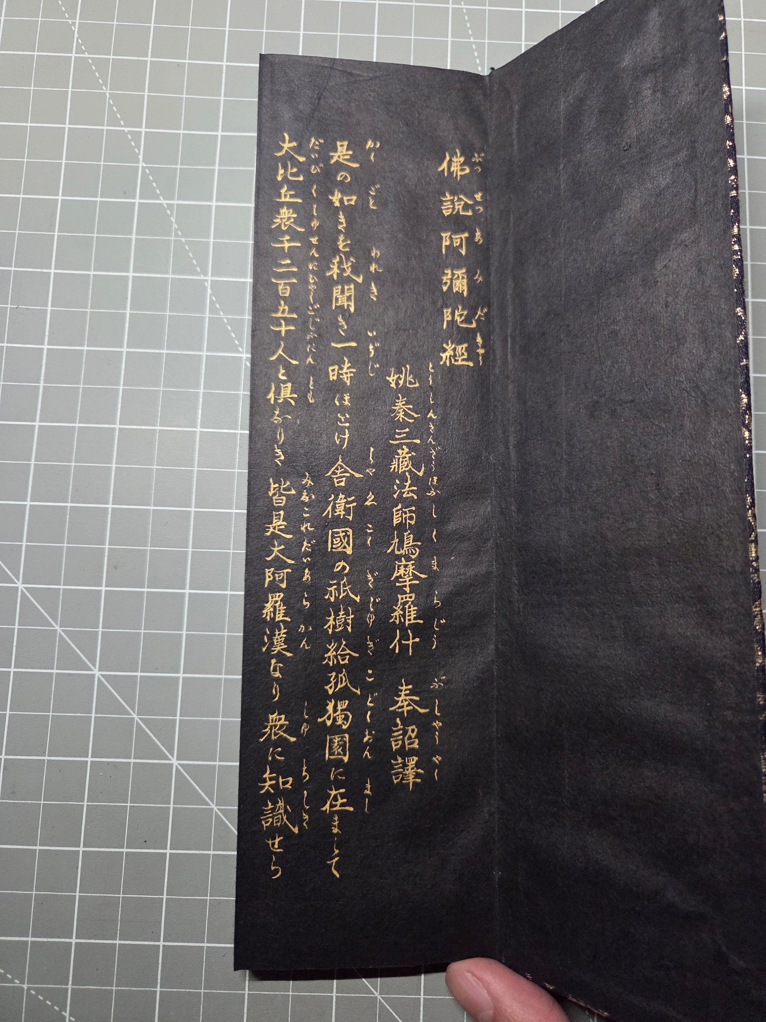 Each manuscript has been written on indigo-dyed paper, in beautiful golden ink, following the style of earlier illuminated sutra fascicules. The Lotus Sutra volumes have been written in standardized format, but the other four fascicules have been accompanied with a full suite of kundoku for Japanese readers, also fully illuminated.