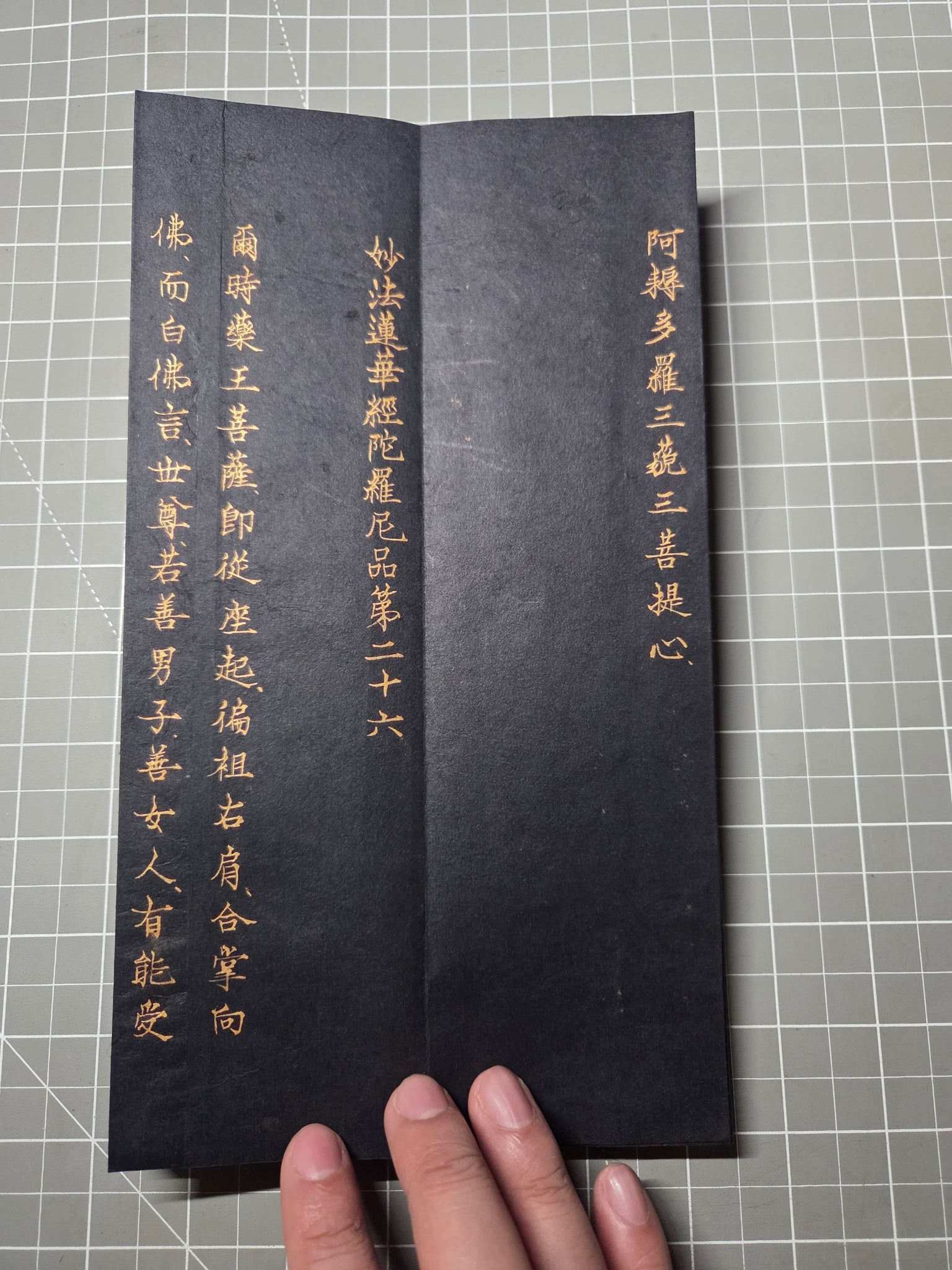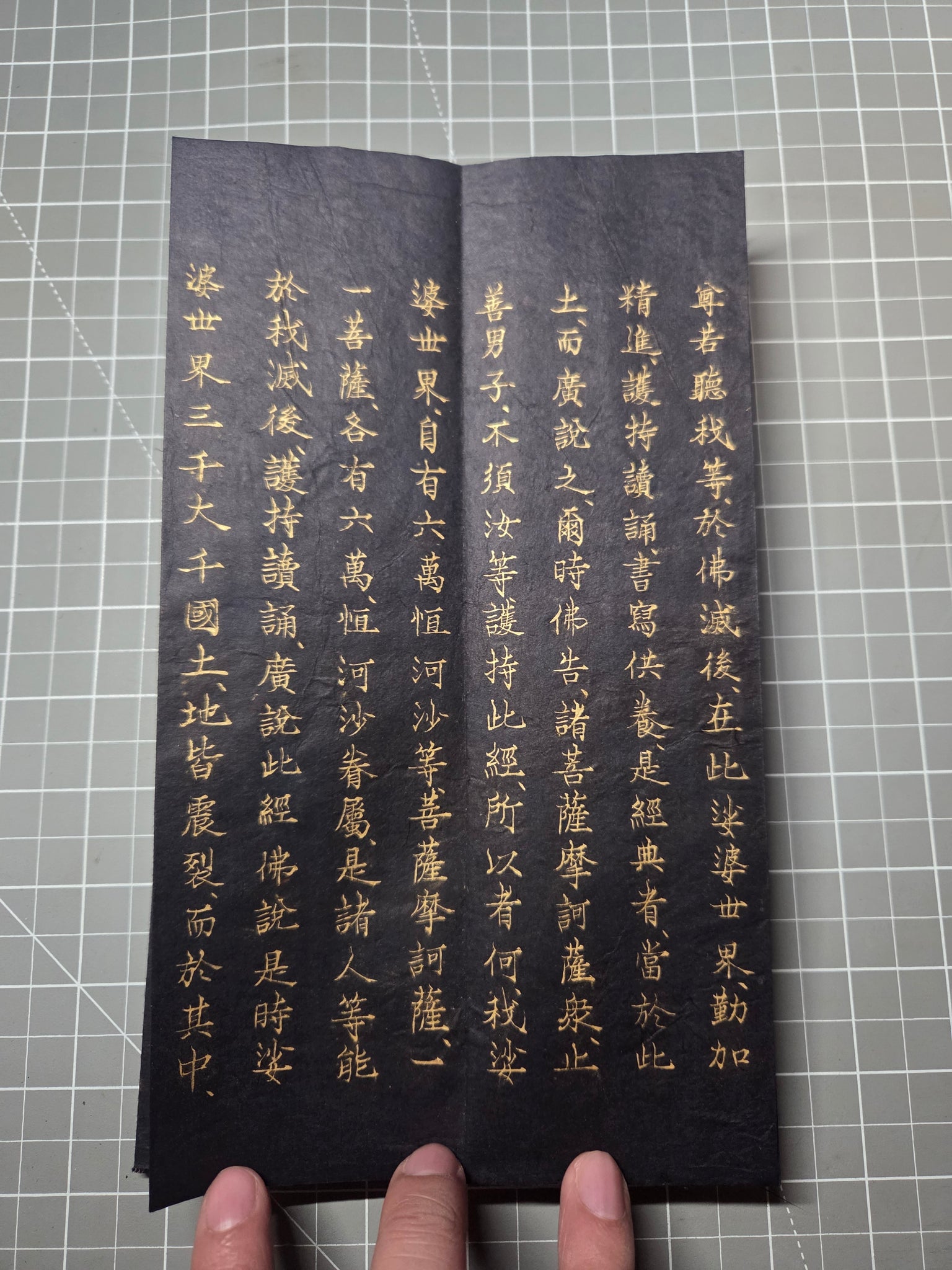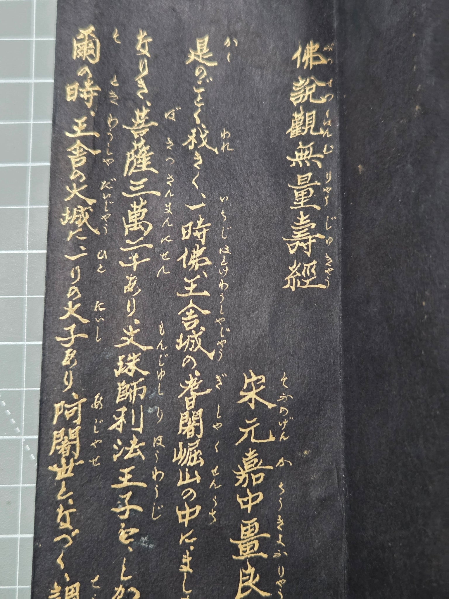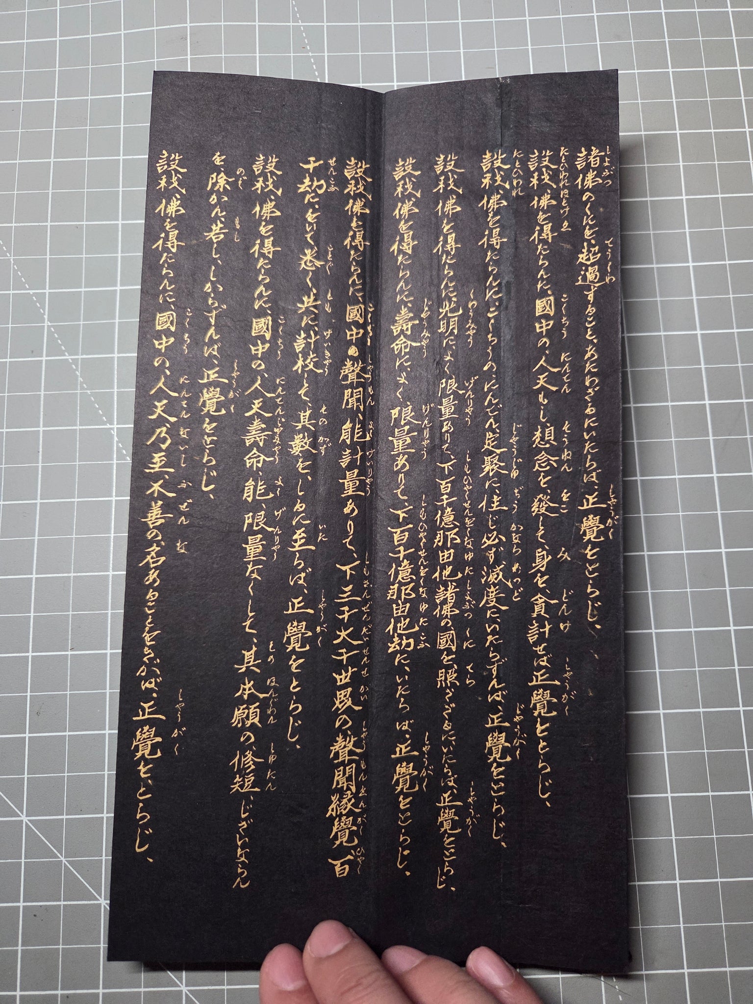 Each manuscript has been written on indigo-dyed paper, in beautiful golden ink, following the style of earlier illuminated sutra fascicules. The Lotus Sutra volumes have been written in standardized format, but the other four fascicules have been accompanied with a full suite of kundoku for Japanese readers, also fully illuminated.