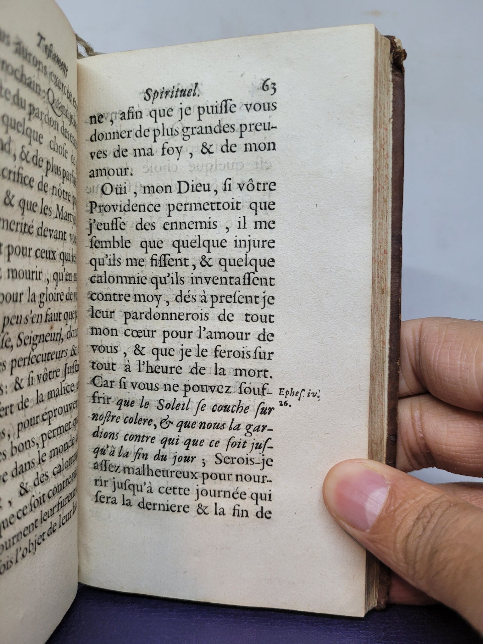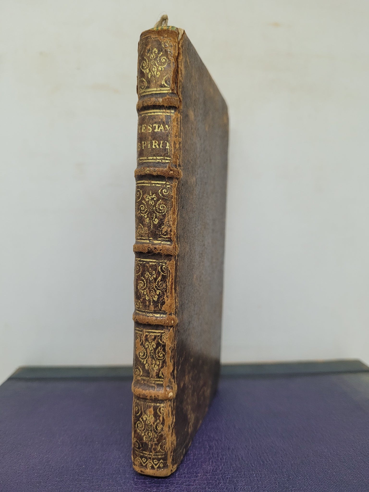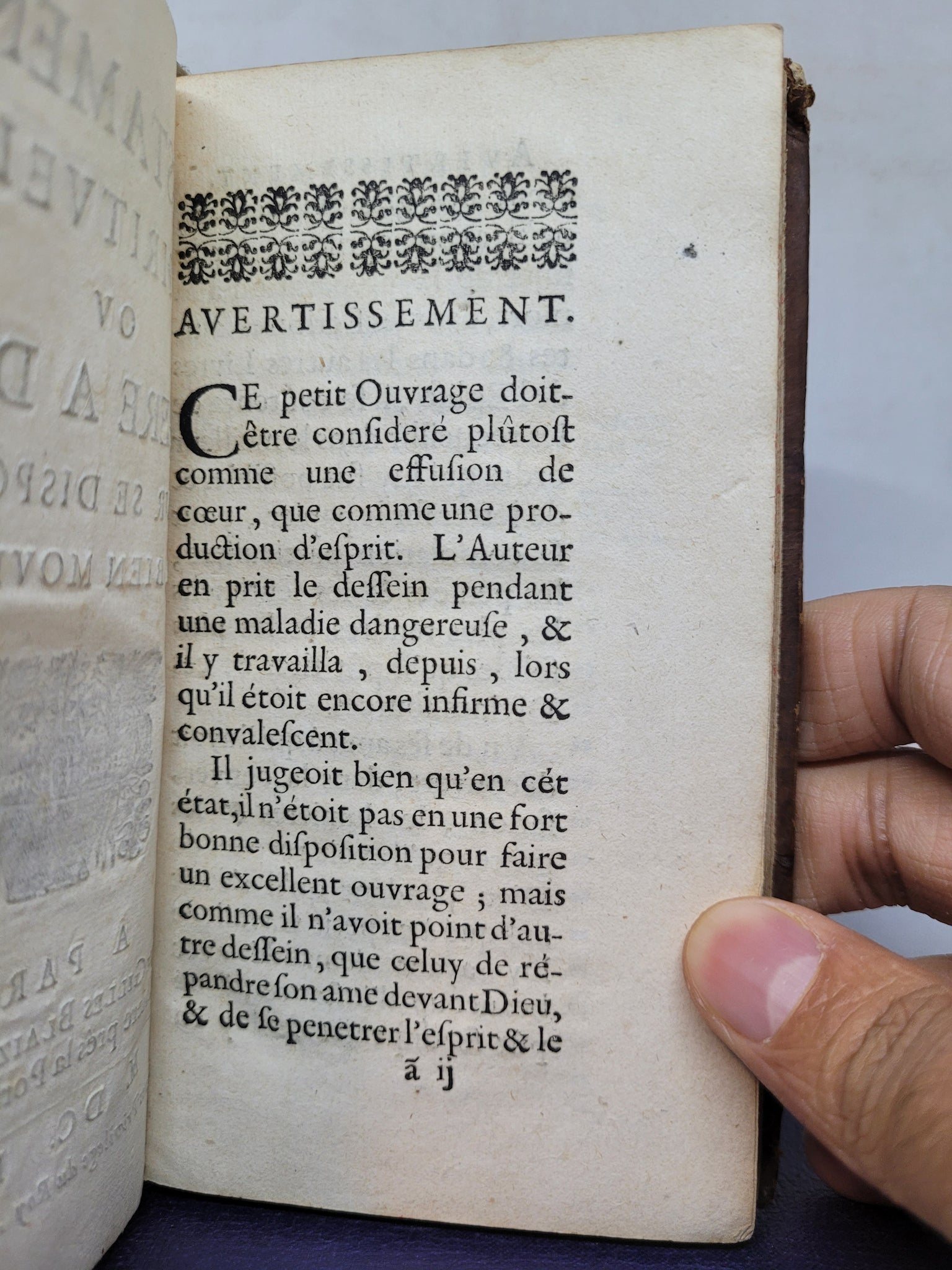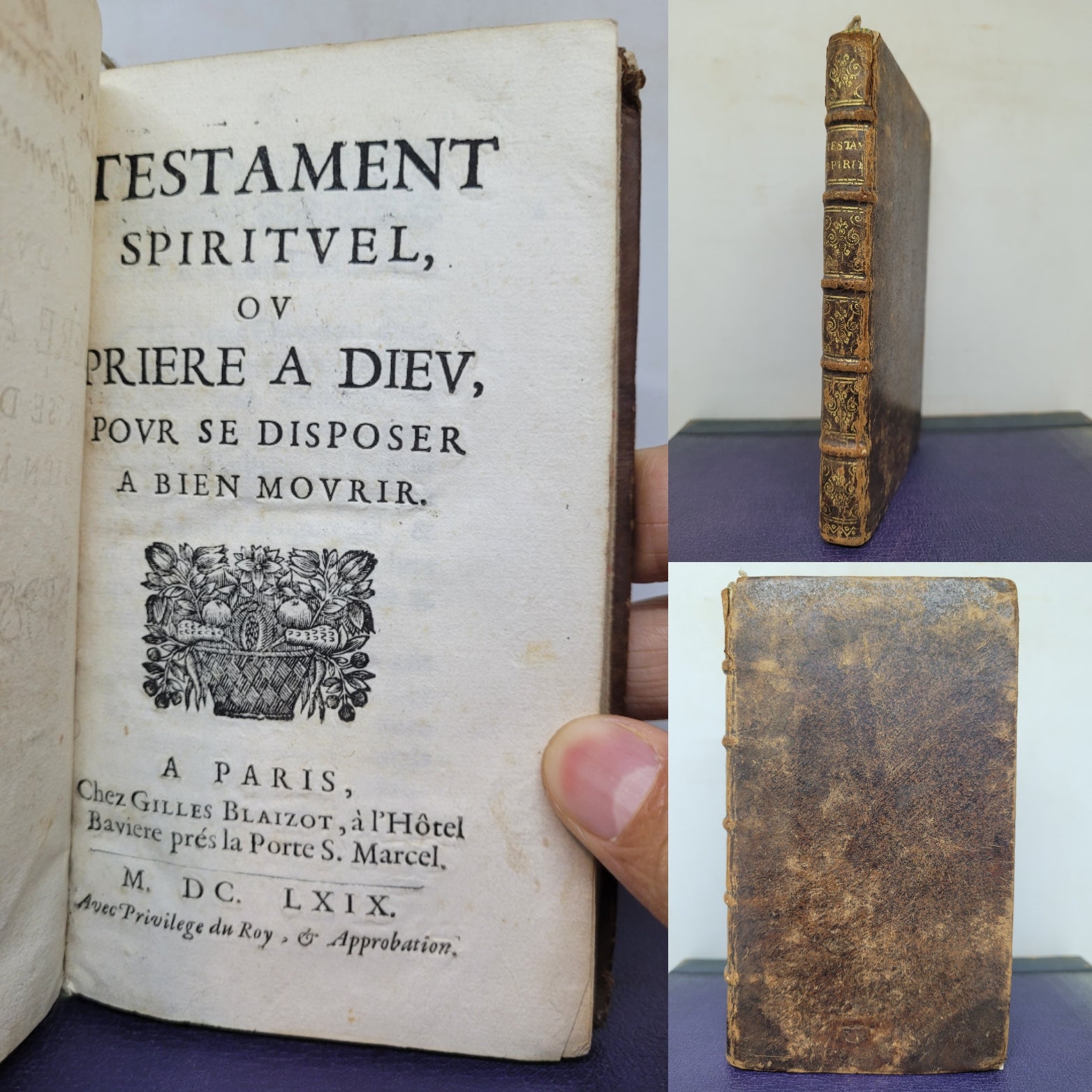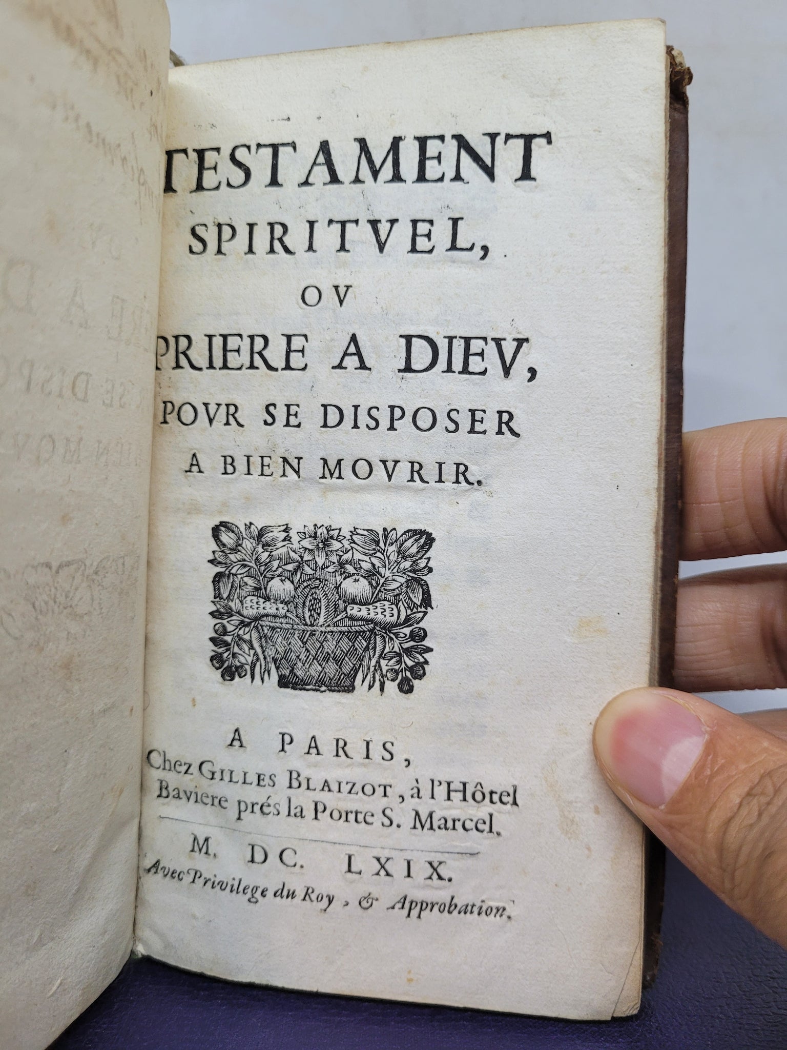Testament Spirituel, ou Priere a Dieu pour se Disposer a Bien Mourir. Gilles Blaizot, Paris, 1669. 12mo. Front end papers have ink writing, as well as pencil notations.